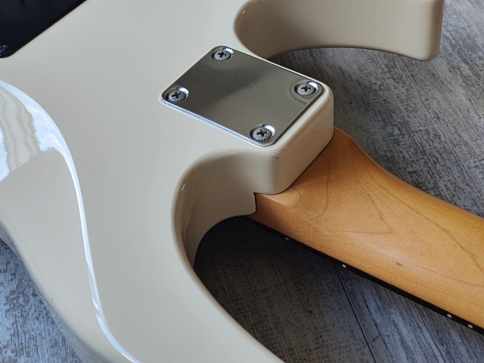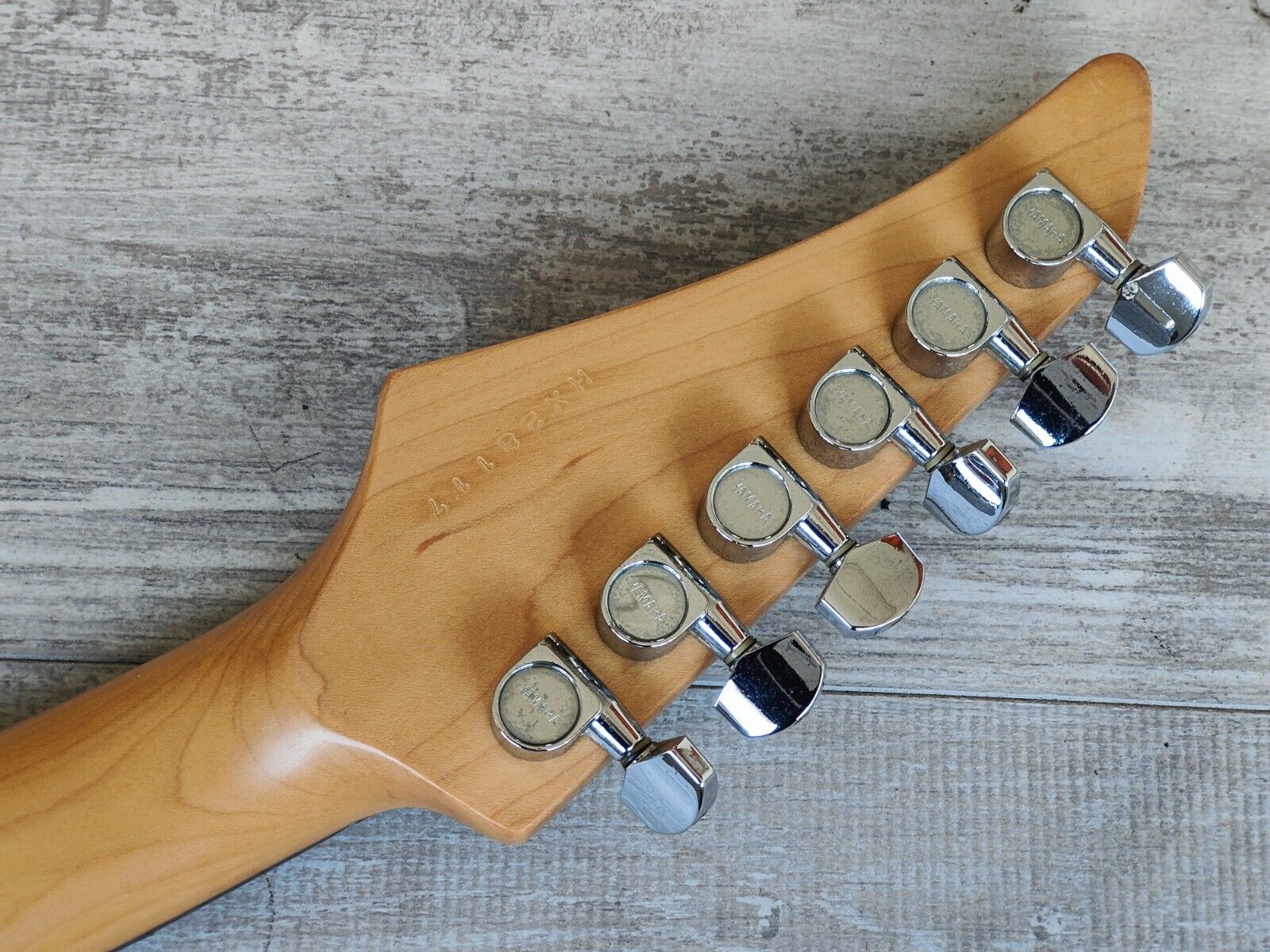 Made between 1991-1994, the Yamaha YGX-121FP model features the "Free Art Pickguard" (also found on the RGX models) that is essentially a clear plastic pickguard covering the whole body and a choice of 4 designs to go under the guard (this one has two included) or you can make your own! Alder body with a vintage white finish bolted to a maple neck and 22 fret bubinga fingerboard, it weighs 3.8kg's.