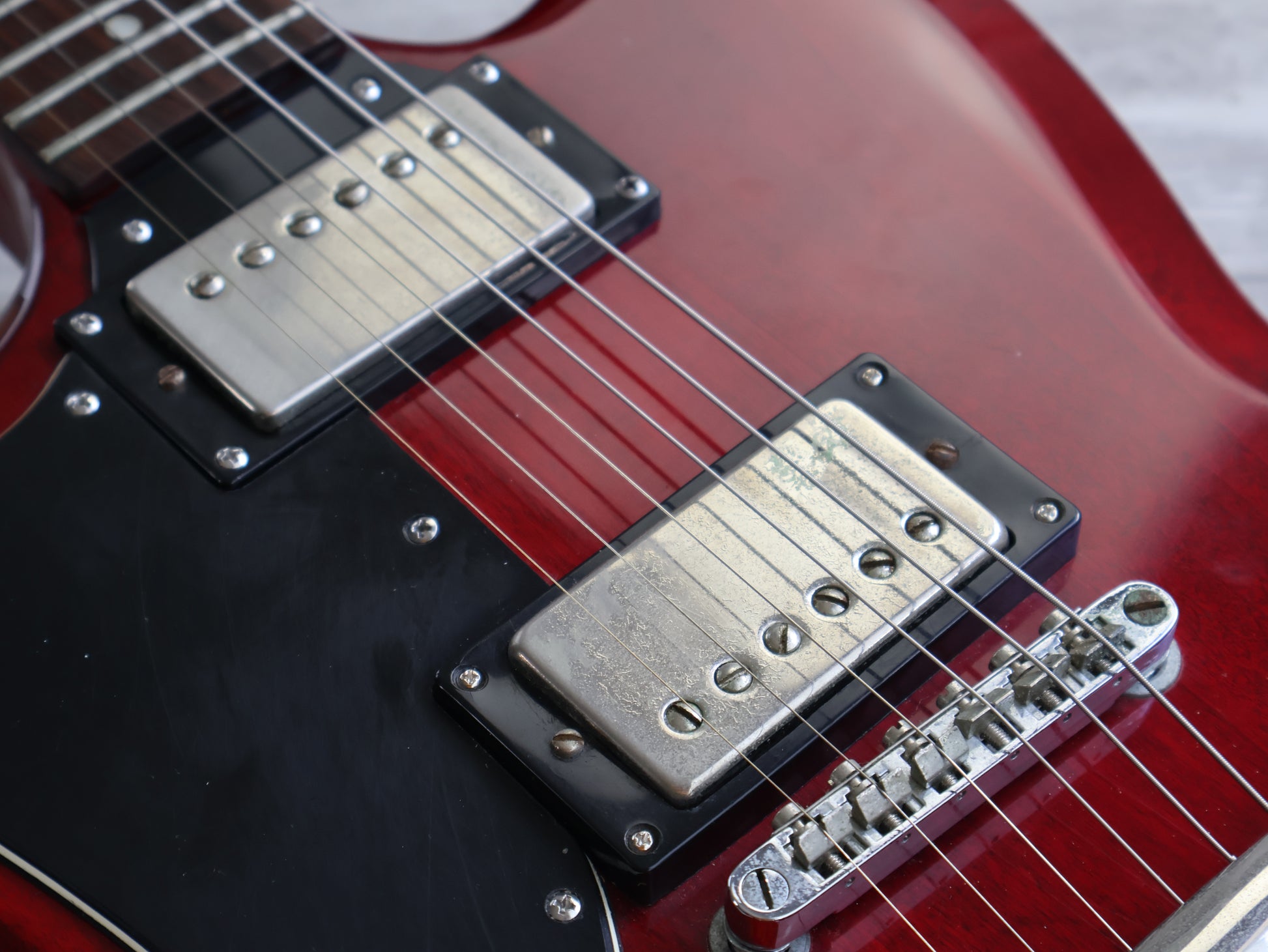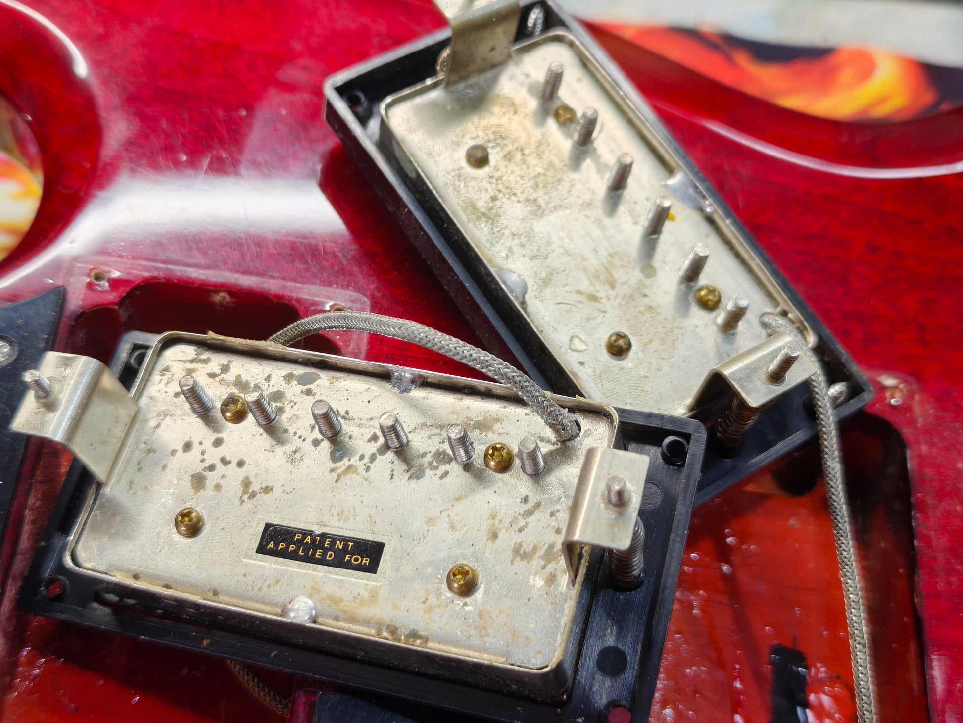 This one has a set of what look to be Gibson Burstbucker humbuckers along with some Gotoh tuners installed and the output jack moved from the side to the top near the knobs.