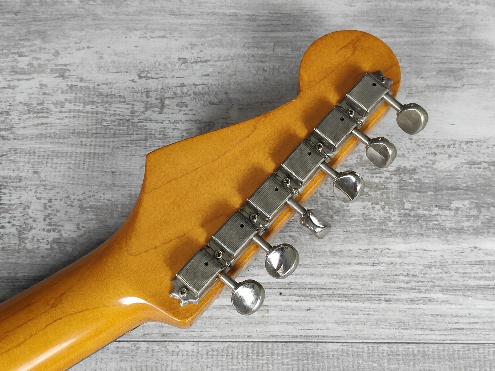 Basswood body with a maple neck, rosewood fingerboard (7.25" radius), it weighs 3.2kg's and is loaded with the original Fender Japan ST-VINTAGE pickups controlled by a 5-way selector. Has a new volume knob and output jack installed otherwise the electronics appear original. The saddles or bridge may have been replaced as they're not Fender stamped but the rest of the hardware seems original.