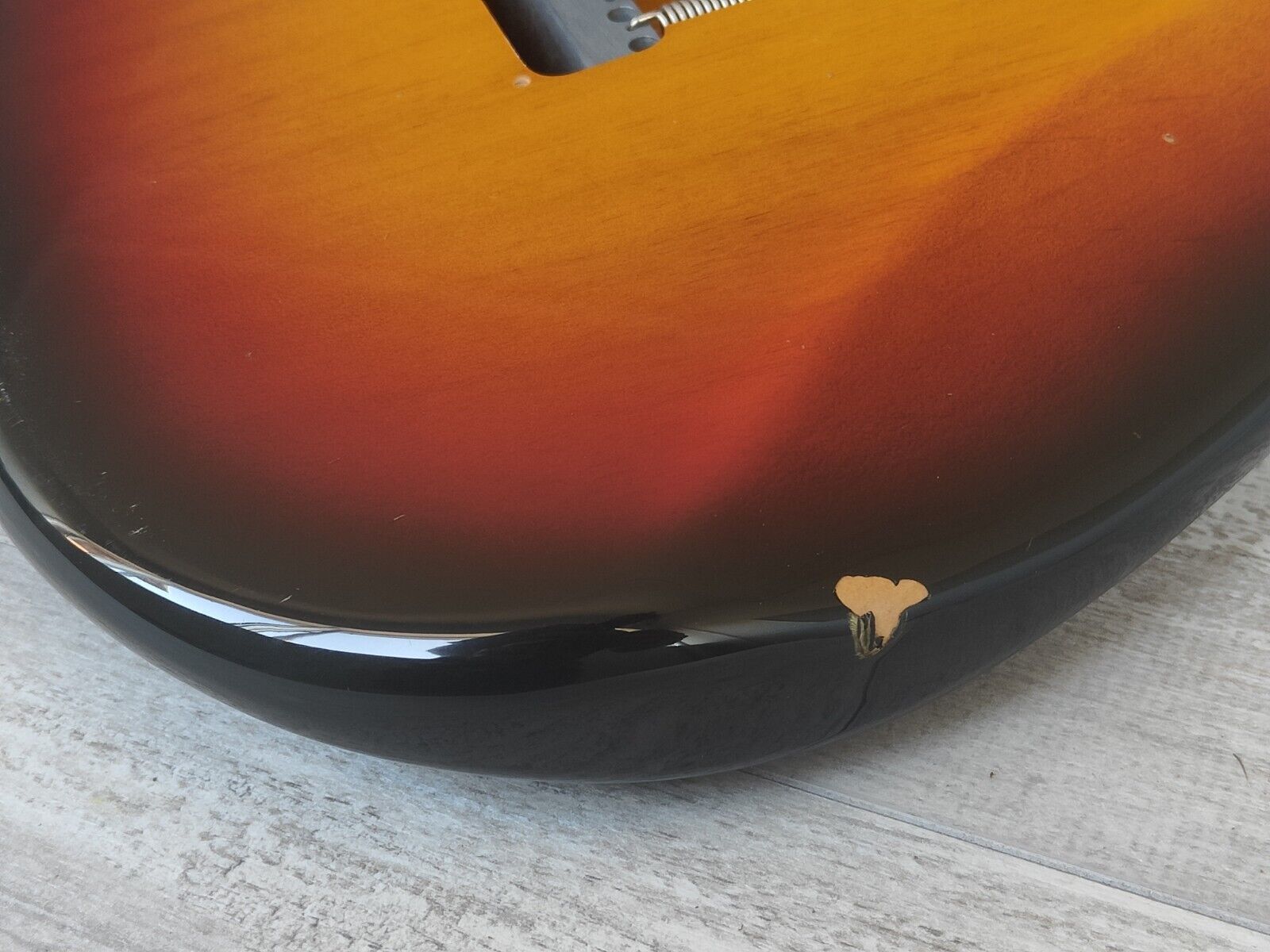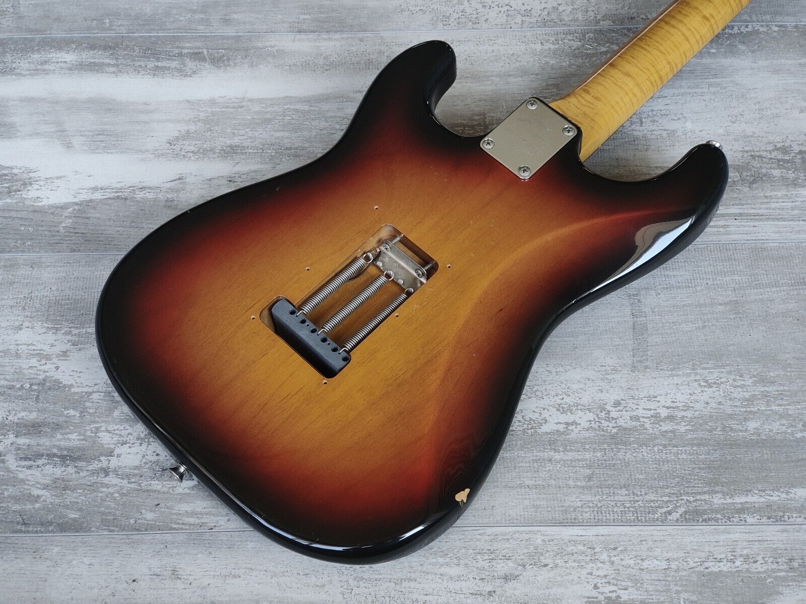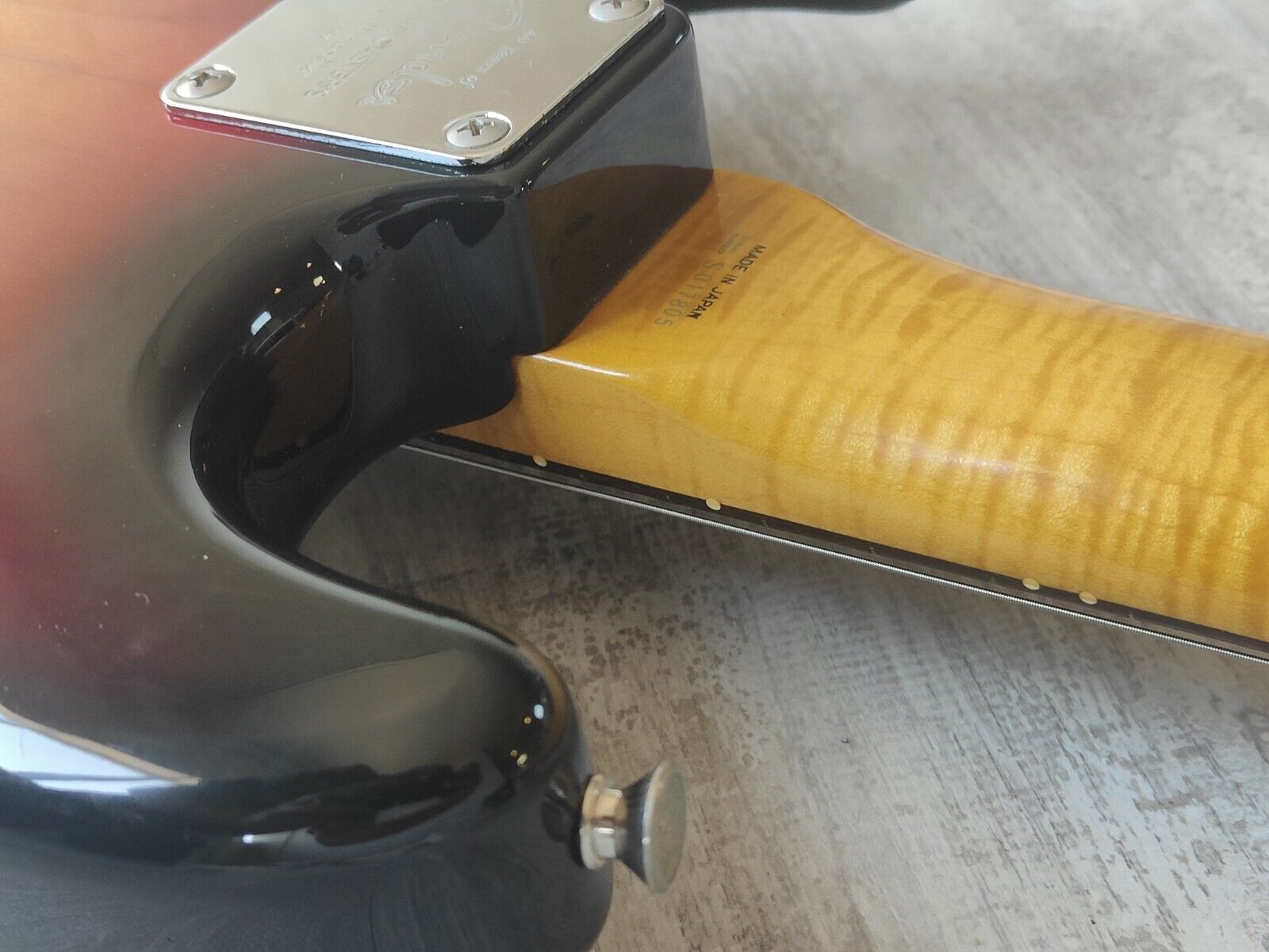 Made in Japan in 1994 to celebrate the 40th Anniversary of the Stratocaster, the ST62-65AS is a celebratory '62 reissue in the classic three-tone sunburst finish. Alder body with a maple neck and rosewood fingerboard (7.25" radius), the neck has the iconic "FotoFlame" laminate finish. Mint green pickguard with Fender Japan ST-Vintage pickups. Weighs 3.3kg's.