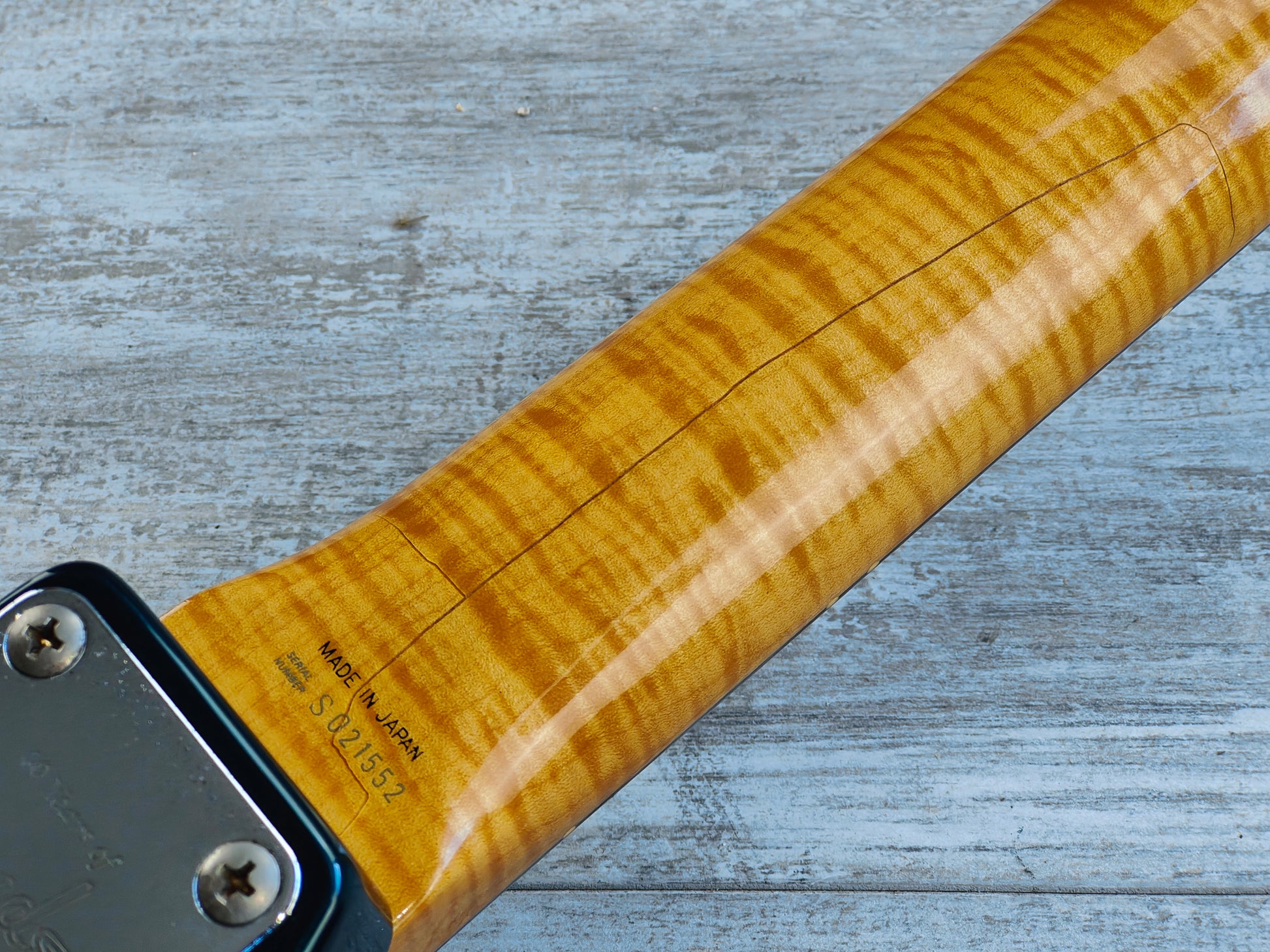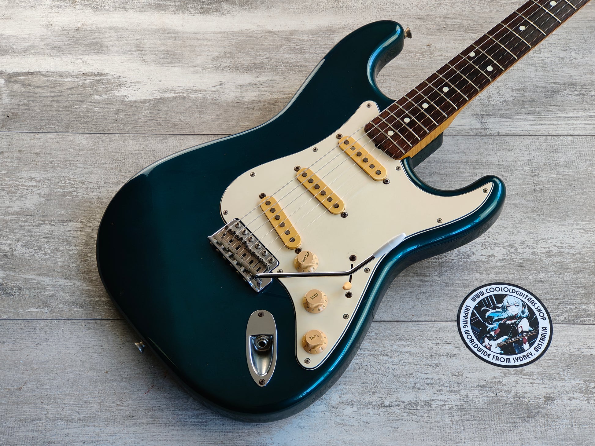 Made in Japan in 1994 to celebrate the 40th Anniversary of the Stratocaster, the ST62-65AS is a celebratory '62 reissue in a very cool faded "lake placid blue" finish that's now got a green tinge. Alder body with a maple neck and rosewood fingerboard (7.25" radius), the neck has the iconic "FotoFlame" laminate finish. Mint green pickguard with Fender Japan ST-Vintage pickups. Weighs 3.5kg's.