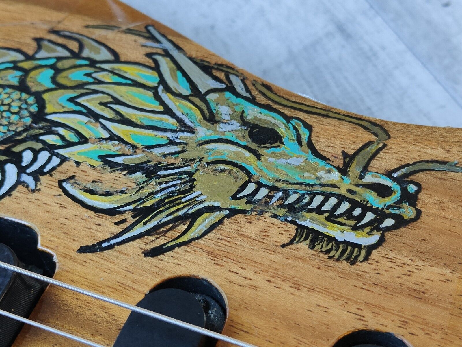Made in Japan in 1994, the FR-120S was a high end model from the Fernandes Revolver series. Natural finish on the Monkey Pod body (featuring a dragon artwork done by the original owner) with a maple neck and dark rosewood fingerboard (13.75" radius, 648mm scale length), it weighs just under 4kg's. Loaded with a Sustainer in the neck position with the original Fernandes HS pickups in the middle and bridge positions controlled by master volume/tone knobs and a sustain volume knob along with an on/off toggle for the sustainer and a three-way tone selector.