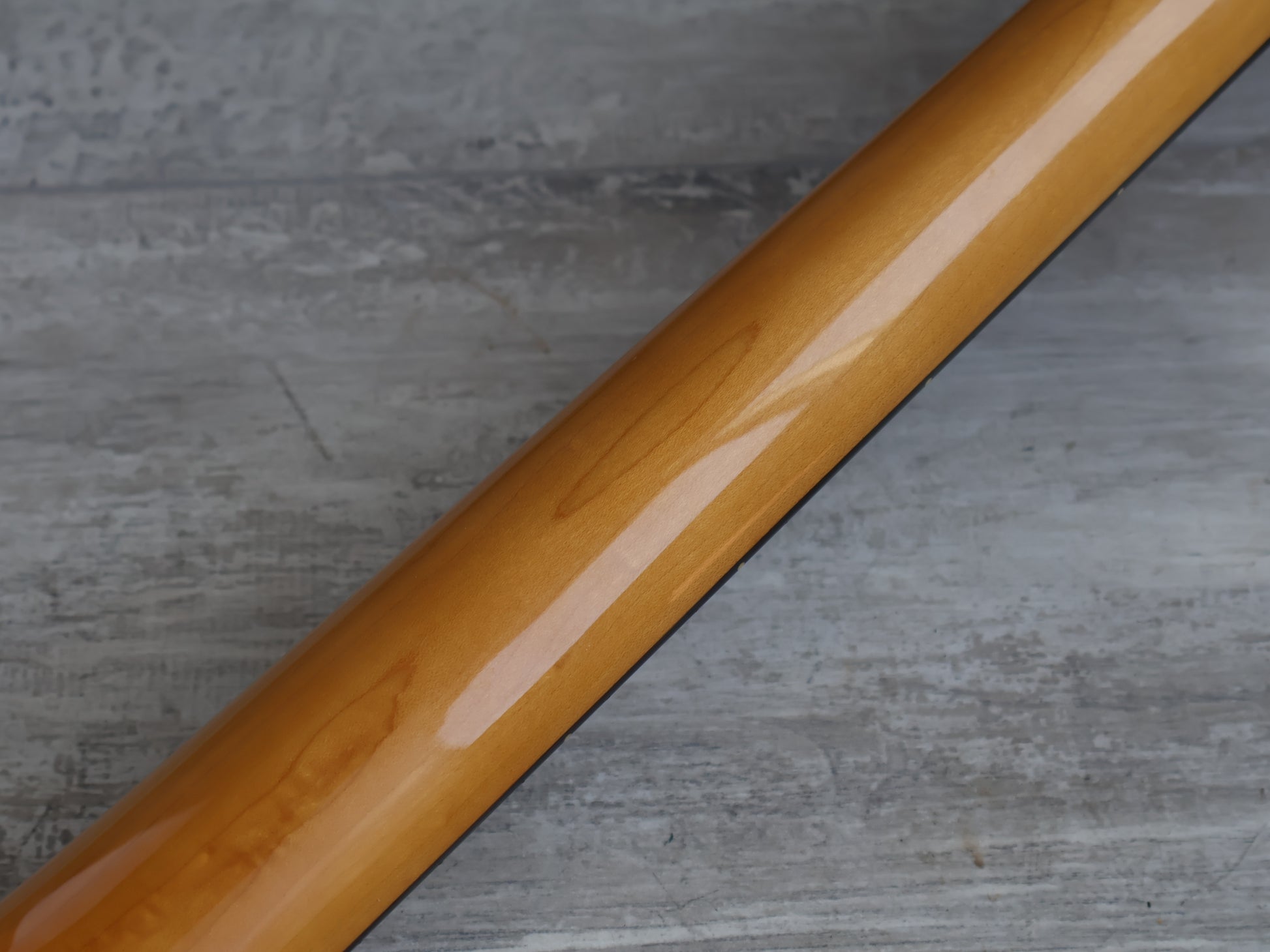 Made in Japan in 1995 (based on the serial number), this appears to be a custom order model made by ESP. Ash body with a quilted maple top and back bolted to a maple neck with a pronounced V profile and a 22 fret ebony fingerboard (648mm scale length), it weighs just under 4kg's. Loaded with a pair of branded ESP passive single coils controlled by a single ESP full sized volume pot and a three-way pickup selector. Gotoh tuners and a gold string-through bridge keep it in tune perfectly.