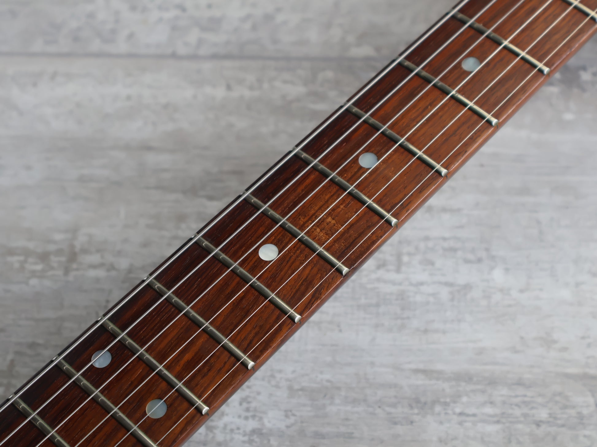 Tokai Talbo (Tokai Aluminium Body) guitars were introduced in 1980 and feature a solid aluminium body with a chamber underneath the pickguard. These were known for having a crystal clear clean tone that resonates beautifully both acoustically and plugged-in. Rosewood board and a dark brown stained maple neck, loaded with a 5-way selector controlling the original HSS pickups, weighs 4kg's.