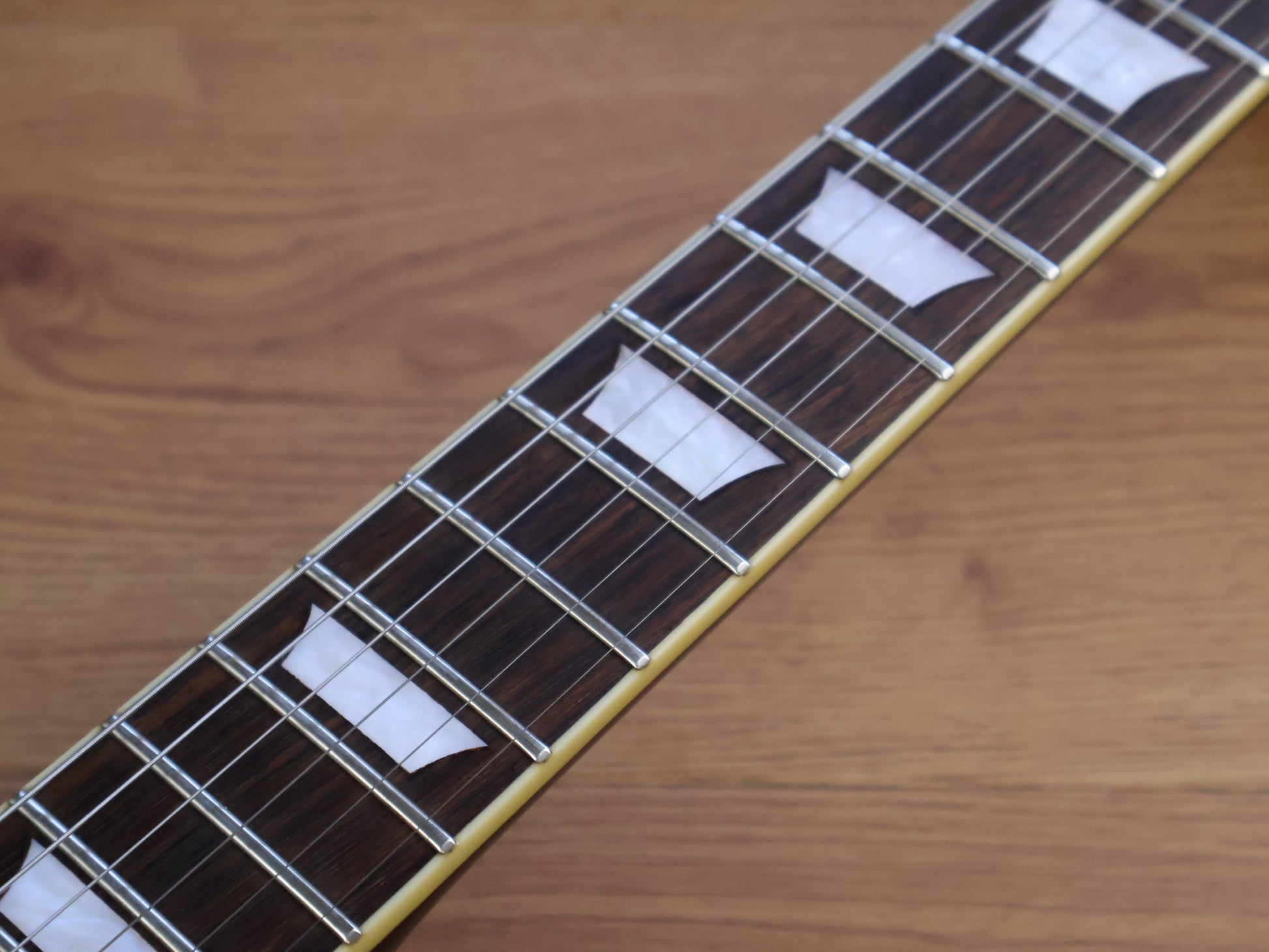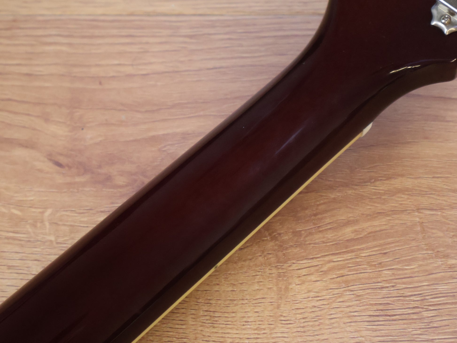 Solid carved maple top with a mahogany back and slim 60's profile neck with a rosewood fingerboard, it weighs a beefy 5kg's and you can hear every single gram when you plug it in. 12" radius with a 43mm nut width.