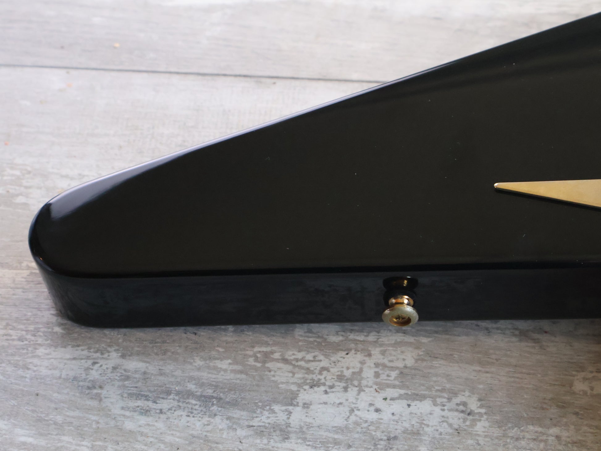 Made in Korea in 2005, this was Epiphone's '58 Reissue Flying V in gloss black. Believed to be a Korina body (according to the catalog) with a medium late 50's profile maple neck and a 22 fret rosewood fingerboard, it weighs 3.3kg's.