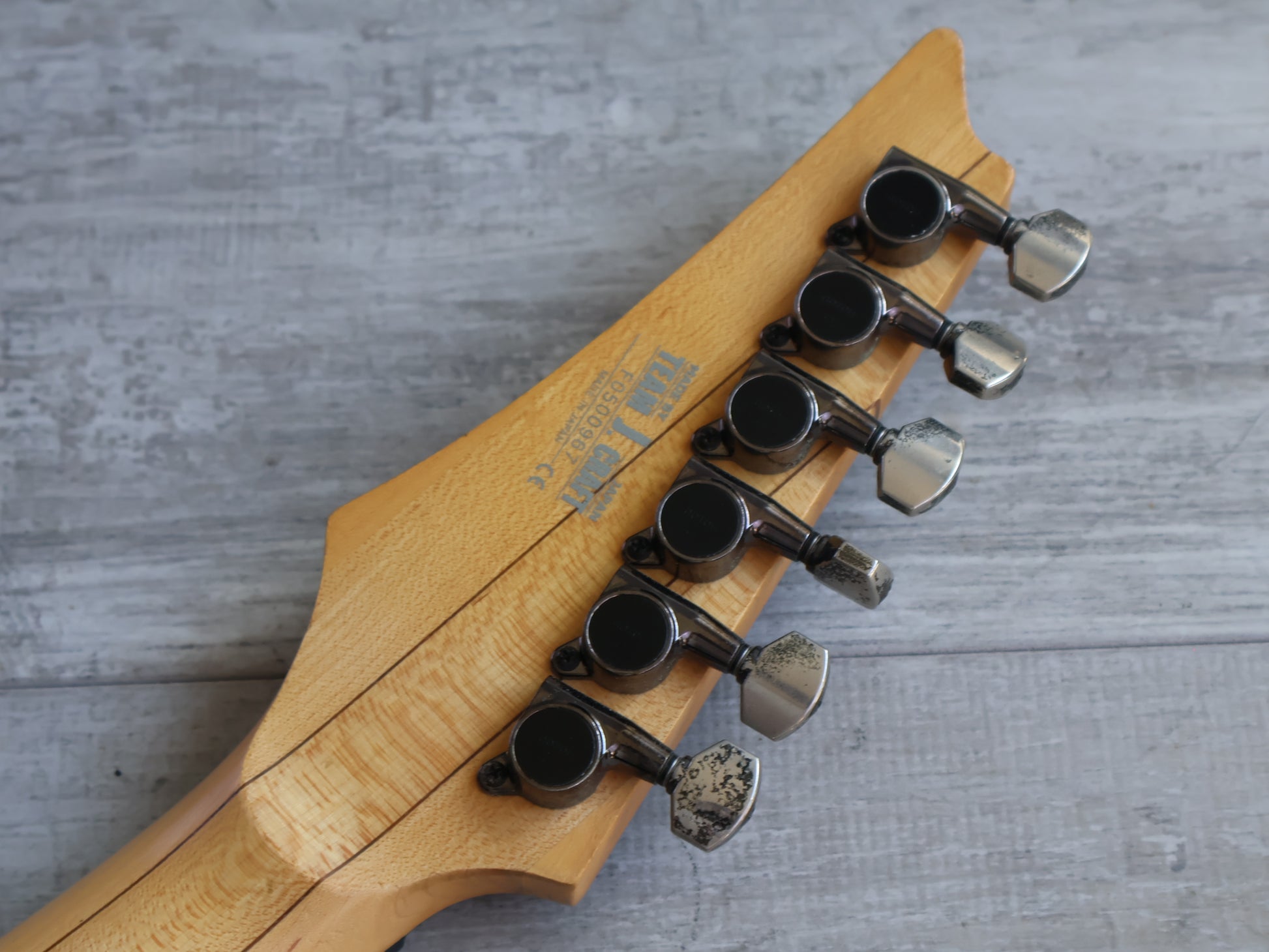 Made by the Fujigen factory in 2005, the RGA321F features an arched-top mahogany body with a AAA flamed maple top bolted to a maple/walnut Wizard neck with a 24-fret rosewood fingerboard and weighs 3.5kg's. Loaded with two Dimarzio IBZ humbuckers, the newly introduced Gibraltar Plus fixed bridge and Gotoh tuners.