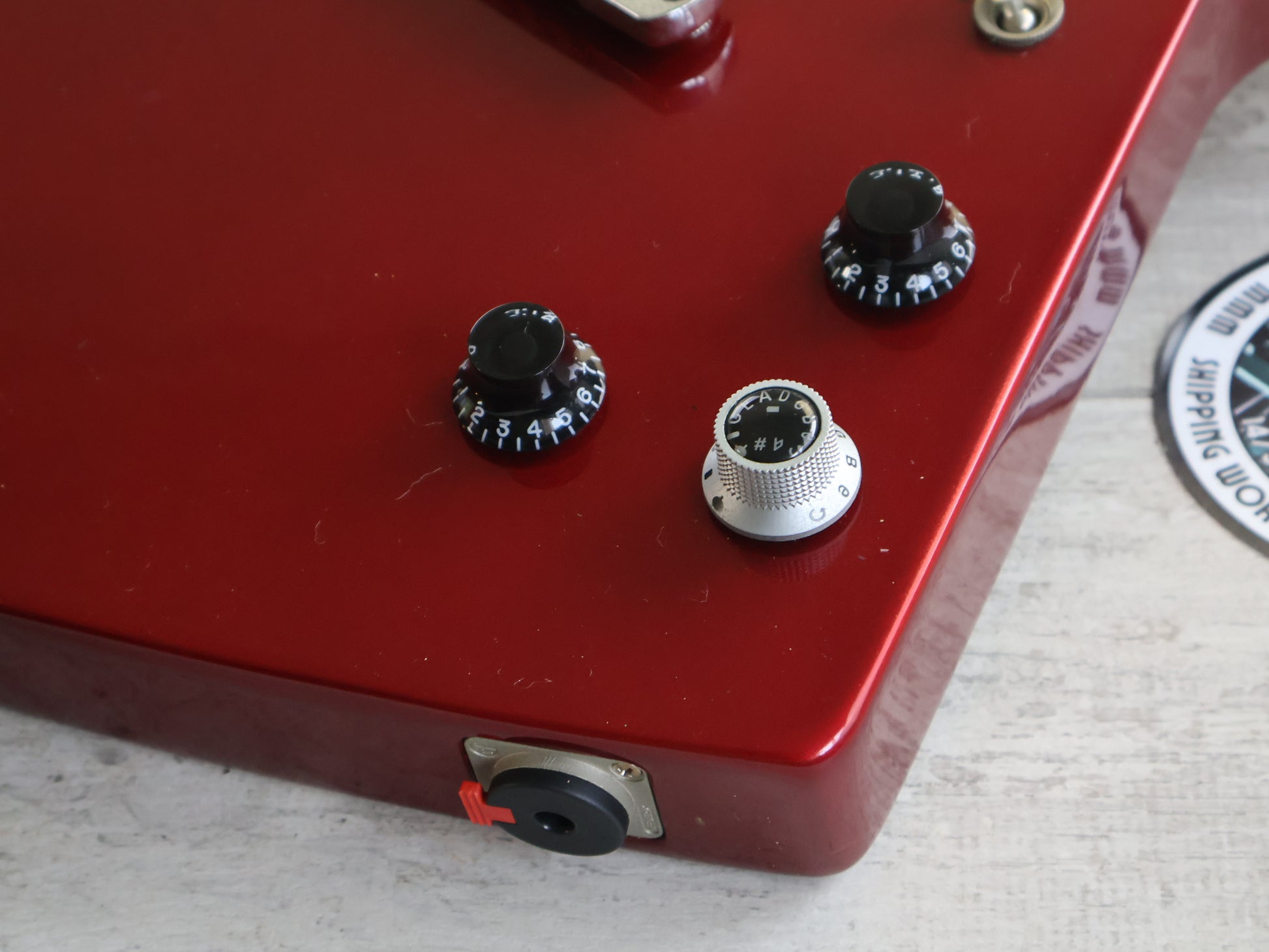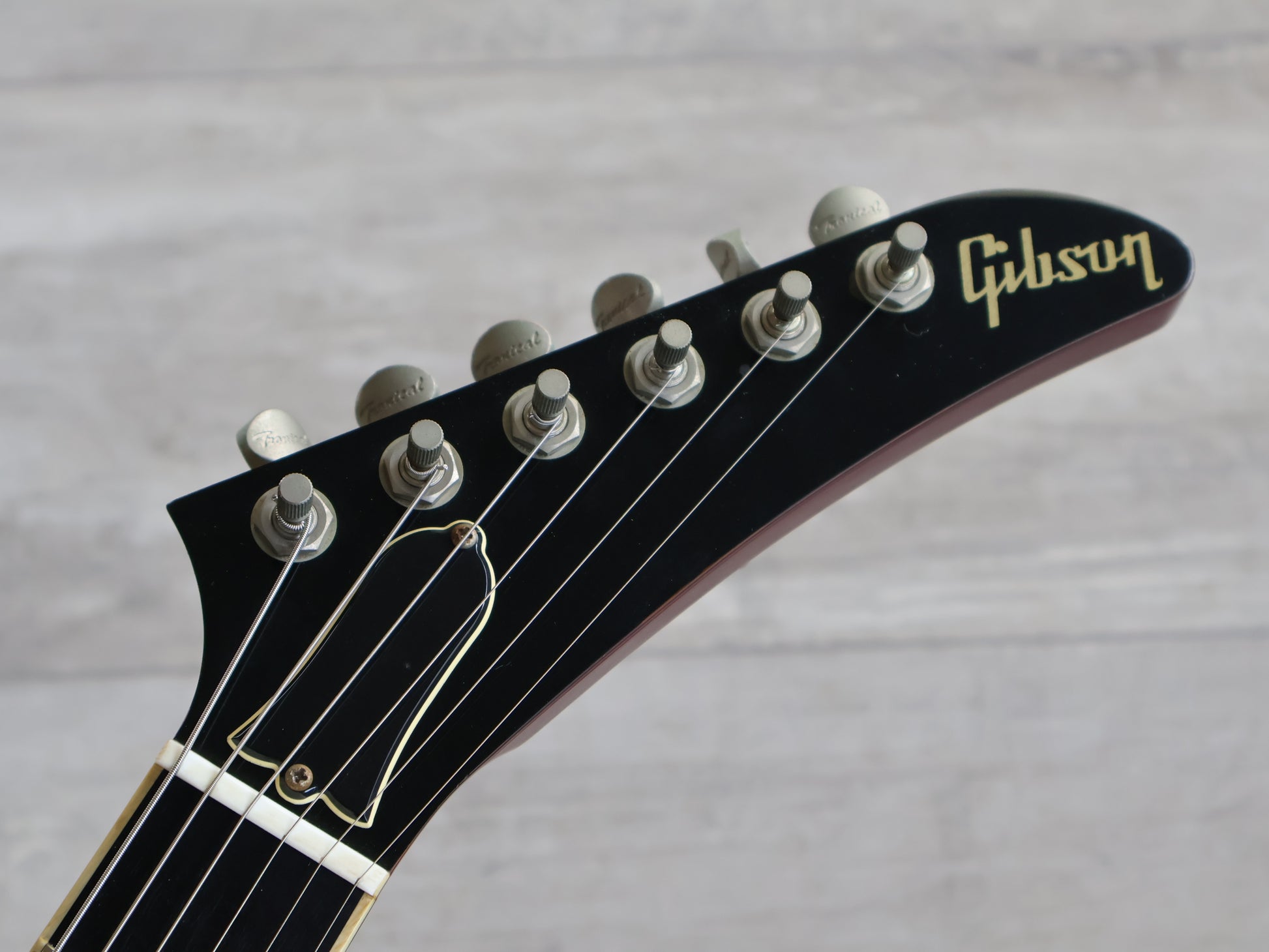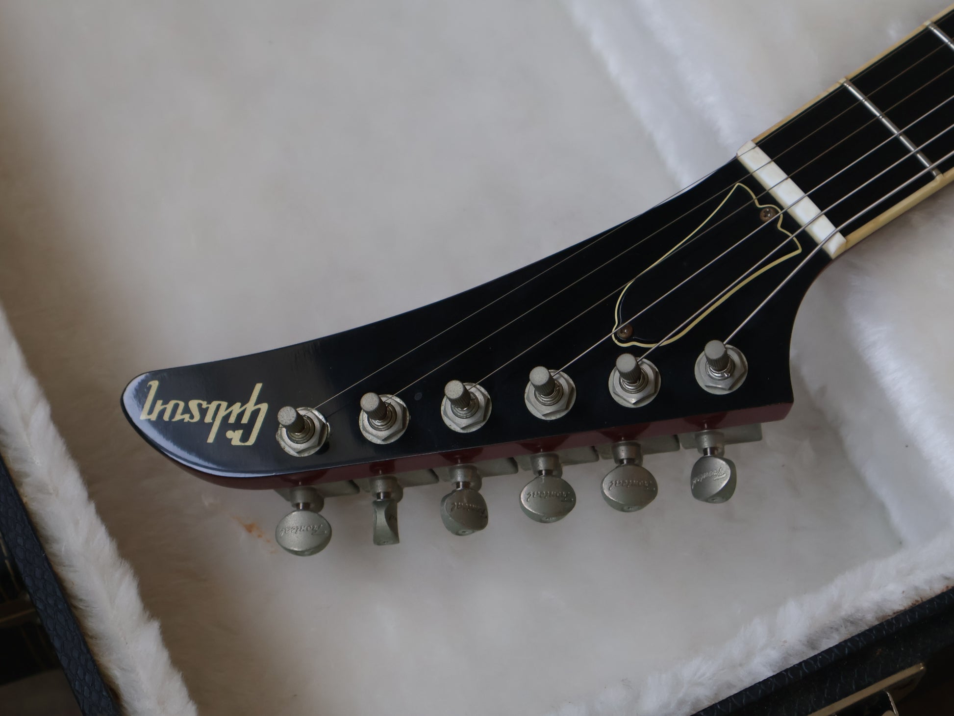 At the heart of Gibson's revolutionary Robot Explorer are its ground-breaking controls. At first glance, the control knobs seem to be indistinguishable from those on any other Explorer. But look again. While the knobs do provide the standard tone and volume controls for each of the two pickups, the Multi-Control Knob (MCK) - the one with the illuminated top - serves as the master control for all aspects of the Robot Explorer's amazing, self-tuning system. The MCK is what is commonly referred to as a "push-pull" knob. When in the normal position (down), it behaves as a regular volume or tone pot. When the MCK is pulled out, the Robot Explorer's radically new self-tuning system is activated and ready for use. It immediately places the Robot Explorer Limited in standard tuning mode (A440). A quick turn of the MCK presents six factory presets, all of which can be customized. At any time, you can also restore the tunings to the factory presets and start all over again. The LED display on top of the MCK also lets you know when a string is out of tune, or when all strings are in tune, and even when the tuners are turning to get them in tune. It even guides the setting of accurate intonation. At the end of the tuning process, the blue lights on top of the MCK flash. Push the MCK back in and it's ready to go. The only thing you have to do is play.