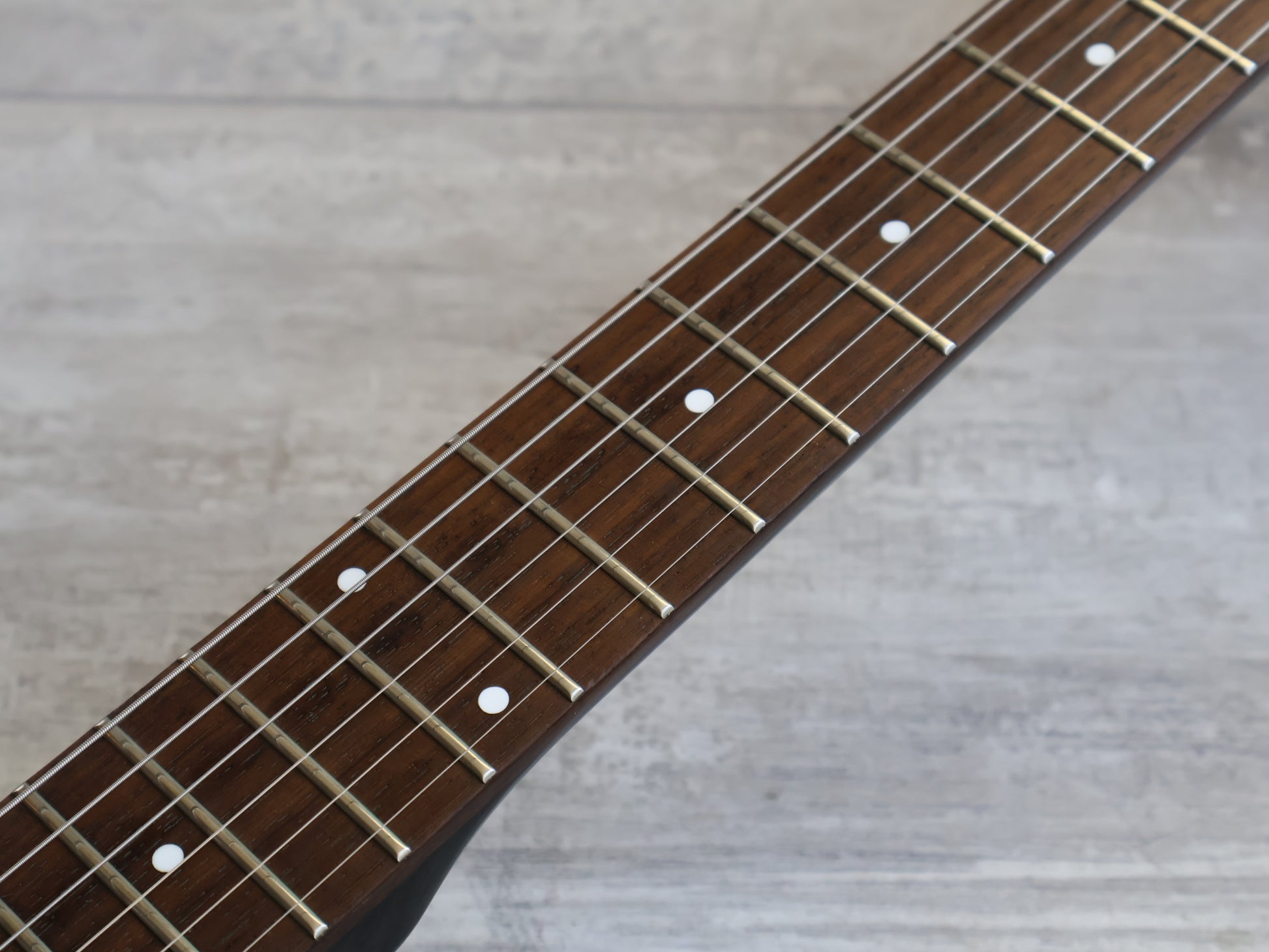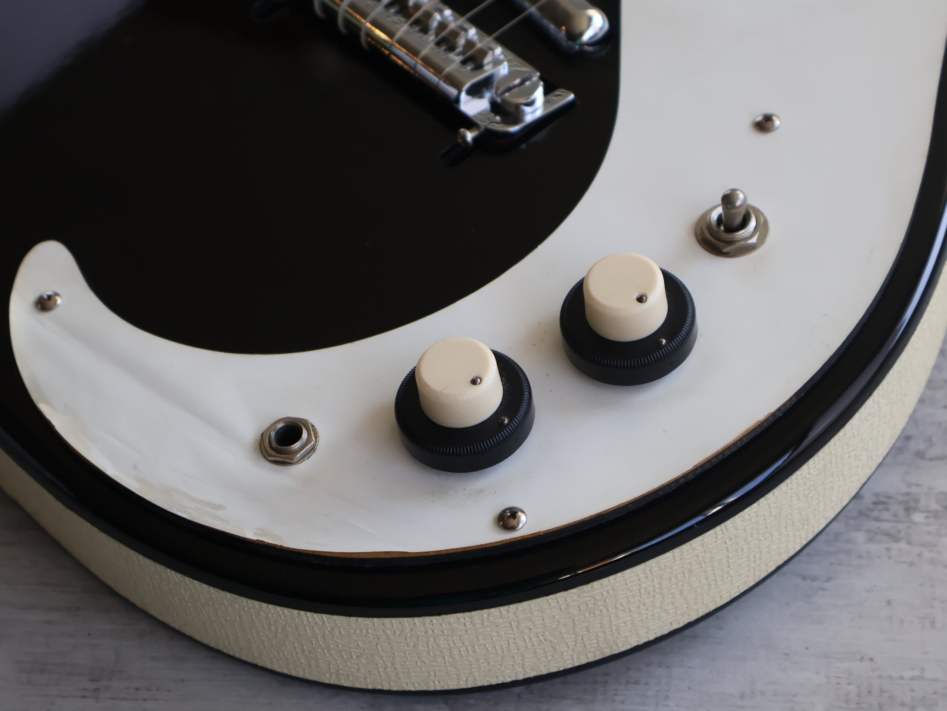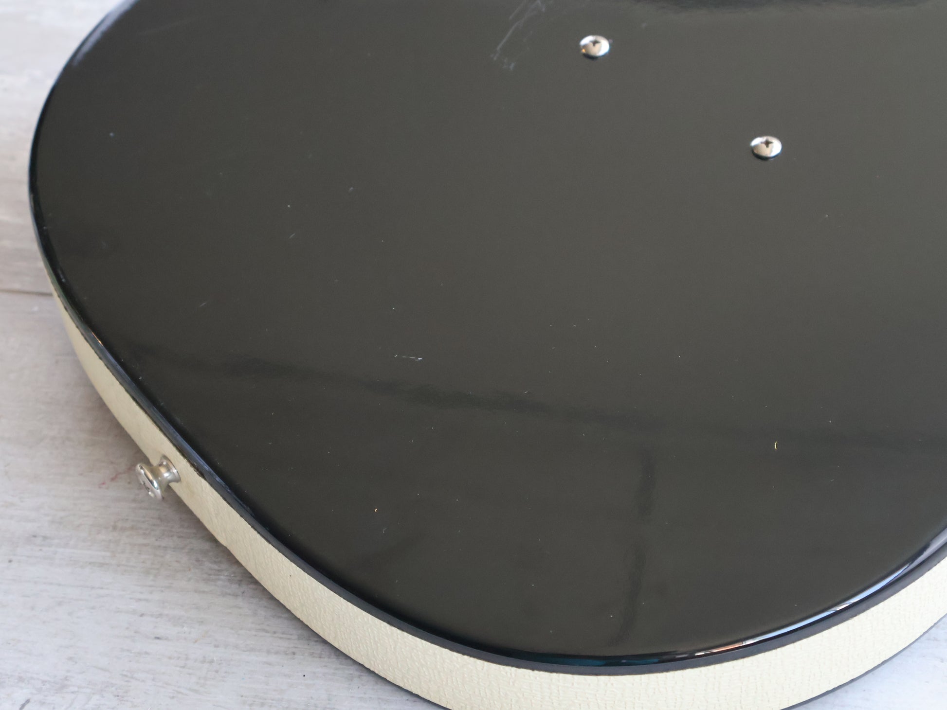 Made in the 2010's, this is a very well made Korean reissue of the DC59. Comfortable double cutaway design with white vinyl binding around the sides, bolt on maple neck with a 21 fret rosewood fingerboard. All original including a pair of Danelectro Lipstick single coils, the "M" version of these was factory loaded with a wraparound style bridge system to emulate Jimmy Page's guitar.