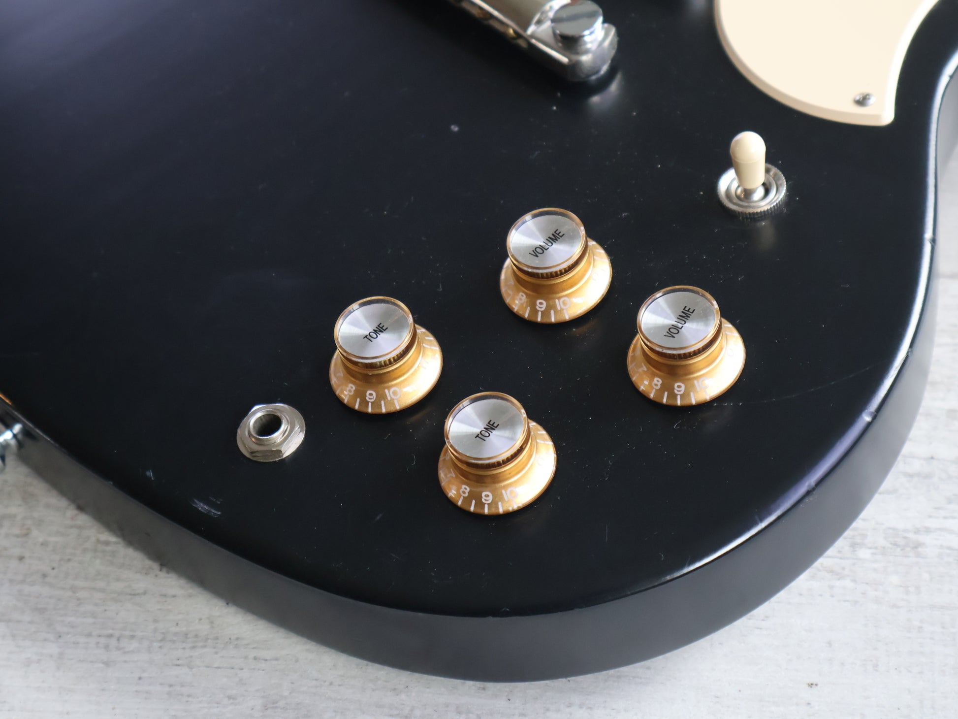 Classic Gibson controls: 2 volumes, 2 tones, 1 toggle switch for total control