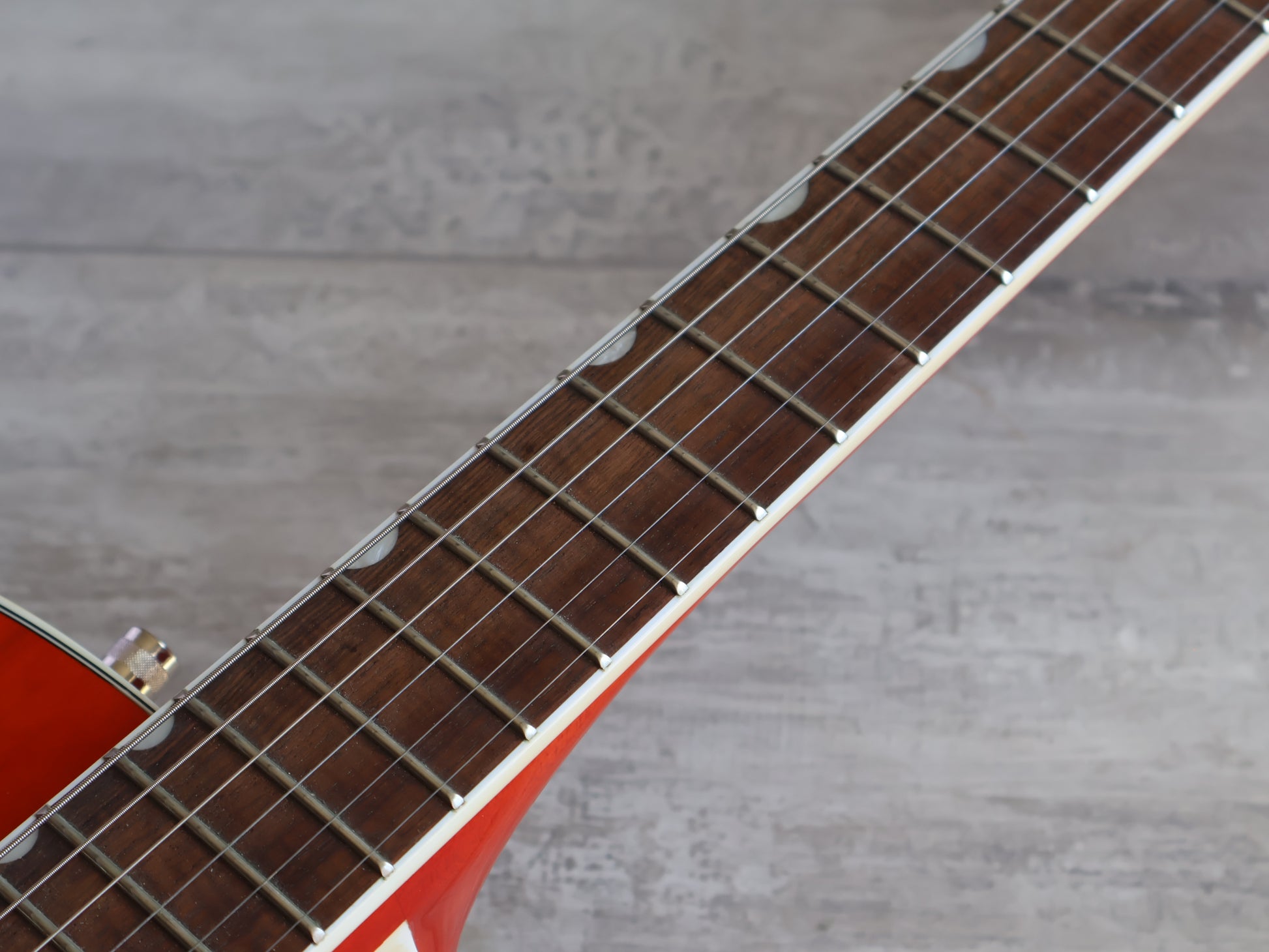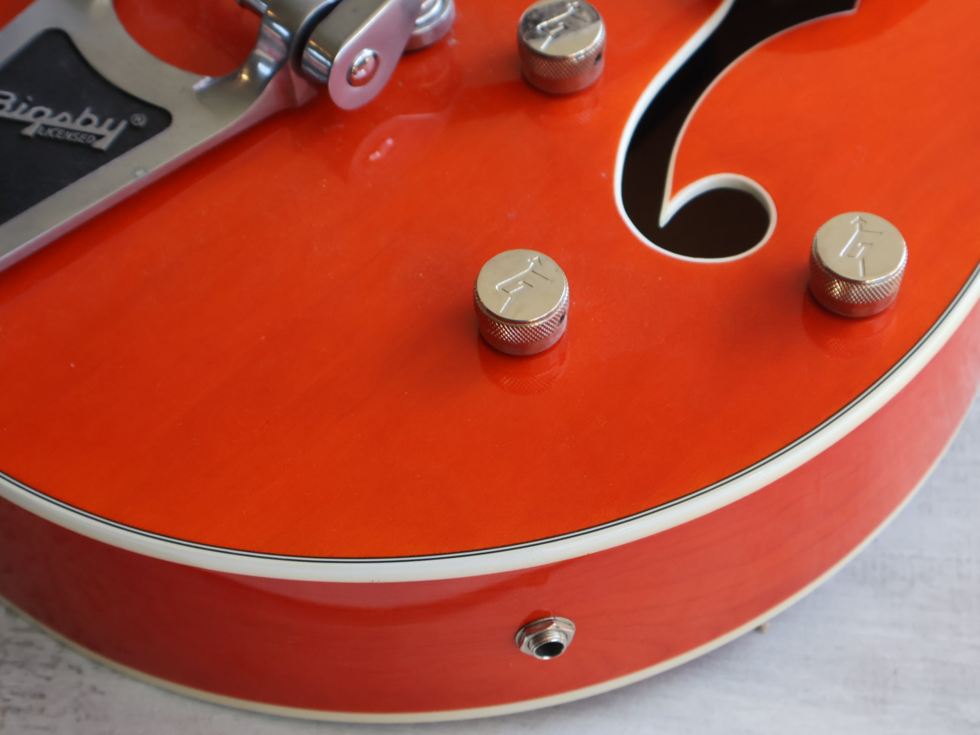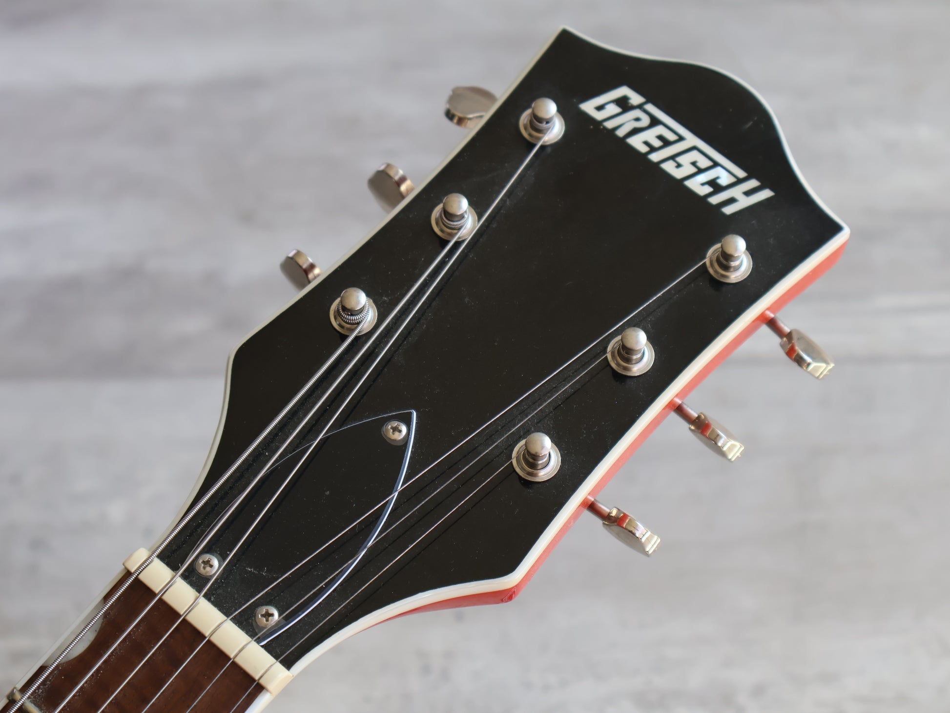 Alive and resonant, the G5420T also features a versatile upgraded control layout including master volume with treble bleed circuit, master tone, individual pickup volume controls and three-position pickup toggle switch, oversized bound F-holes, multi-ply body binding, smaller late-'50s G6120 bound headstock, vintage-style open-back tuning machines, Graph Tech® NuBone® nut, pearloid Neo-Classic™ thumbnail inlays, secured Adjusto-Matic™ bridge and a Bigsby® B60 vibrato tailpiece.