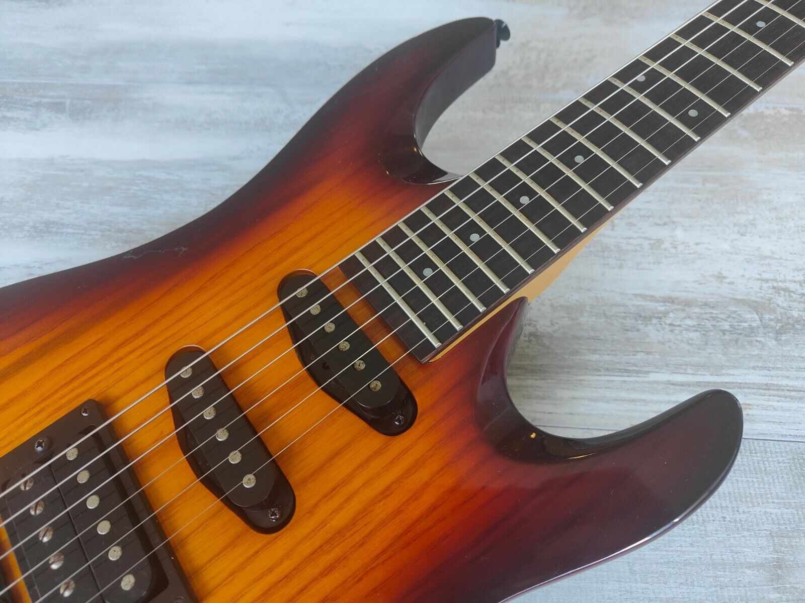 Likely made in Korea in recent years, this is a Magna series superstrat from Aria Pro II. Ash body with a 22 fret rosewood fingerboard (648mm scale length) and a smooth slim maple neck, it weighs a hefty 4kg's. HSS pickups with a coil split on the humbucker (push pull tone knob). Appears all original and was given a basic setup and service prior to listing including a fret polish and fretboard oil.