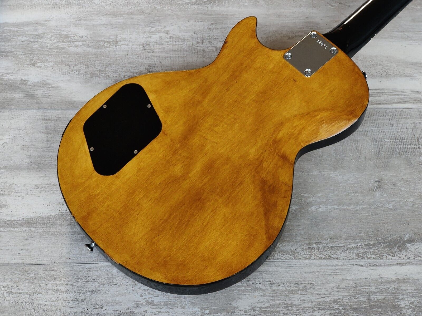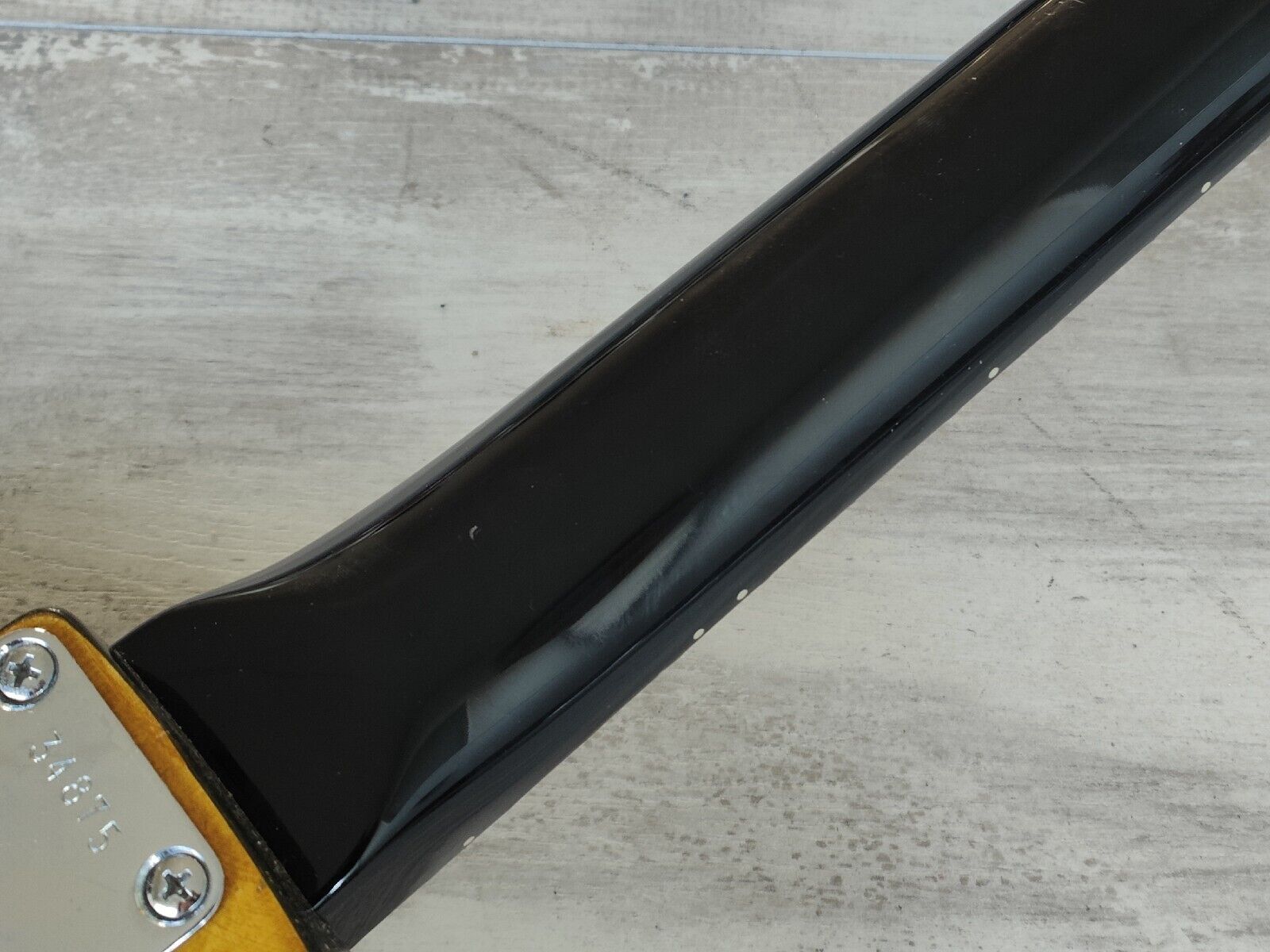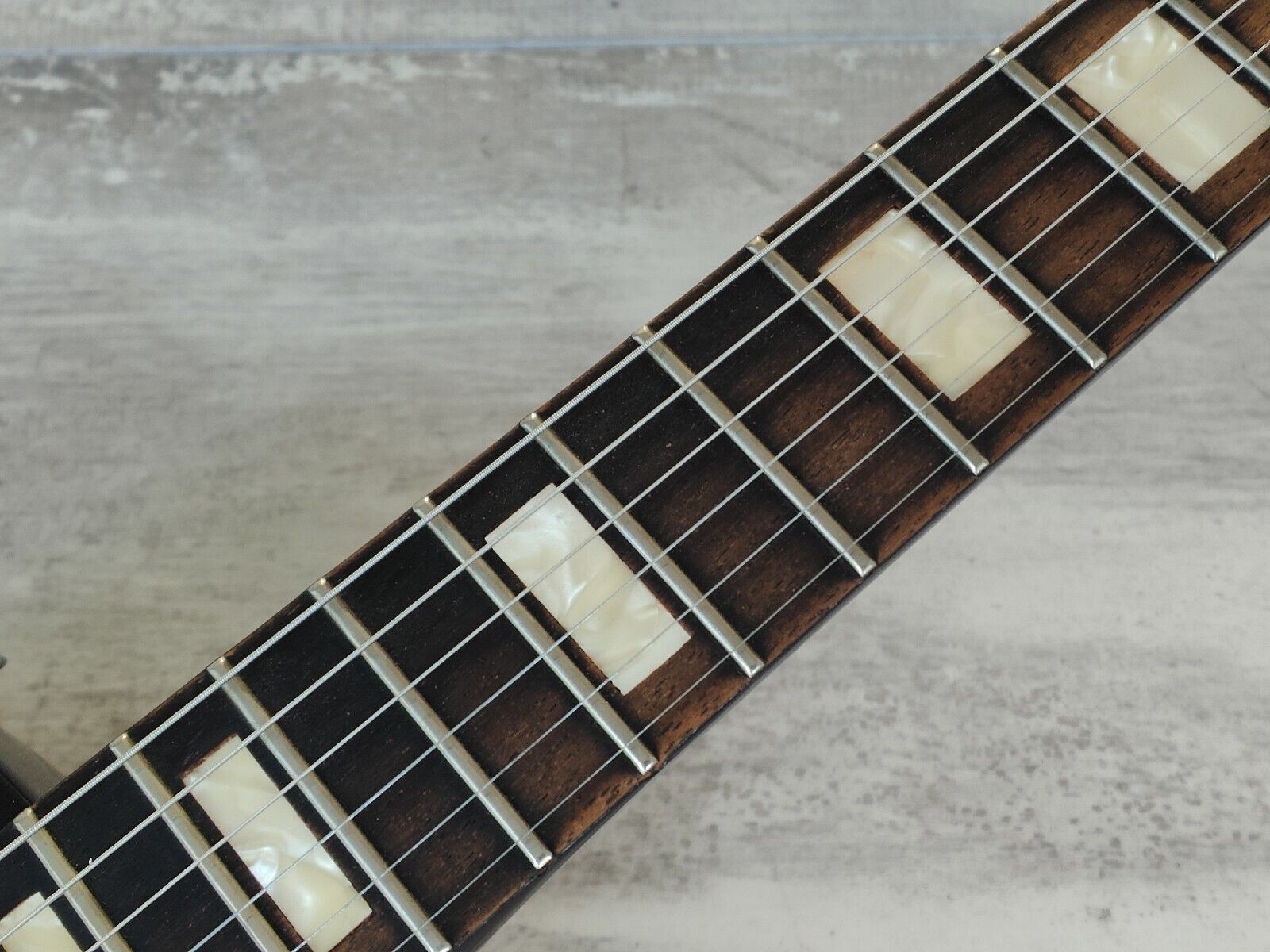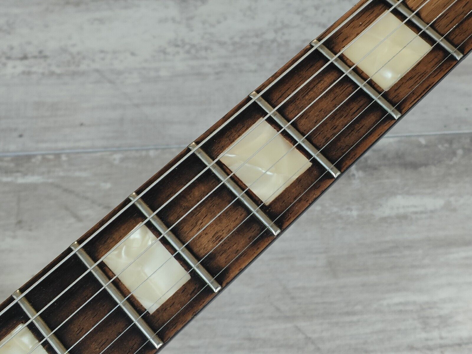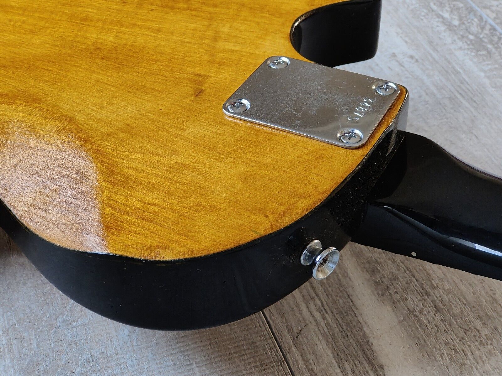 Predating the Epiphone SL series by a number of years, this is a Stratocaster in the body of a Les Paul! Black/redburst finish on the maple body (with a lightly carved top), bolt-on maple neck and rosewood fingerboard (9.5" radius, 22 frets, 628mm scale length), weighs 3.5kg's. Open book headstock and block inlays give it the real Gibson aesthetic, while the HSS pickup configuration gives a true Stratocaster tonal range. 5-way pickup selector with two tone knobs and a master volume control.