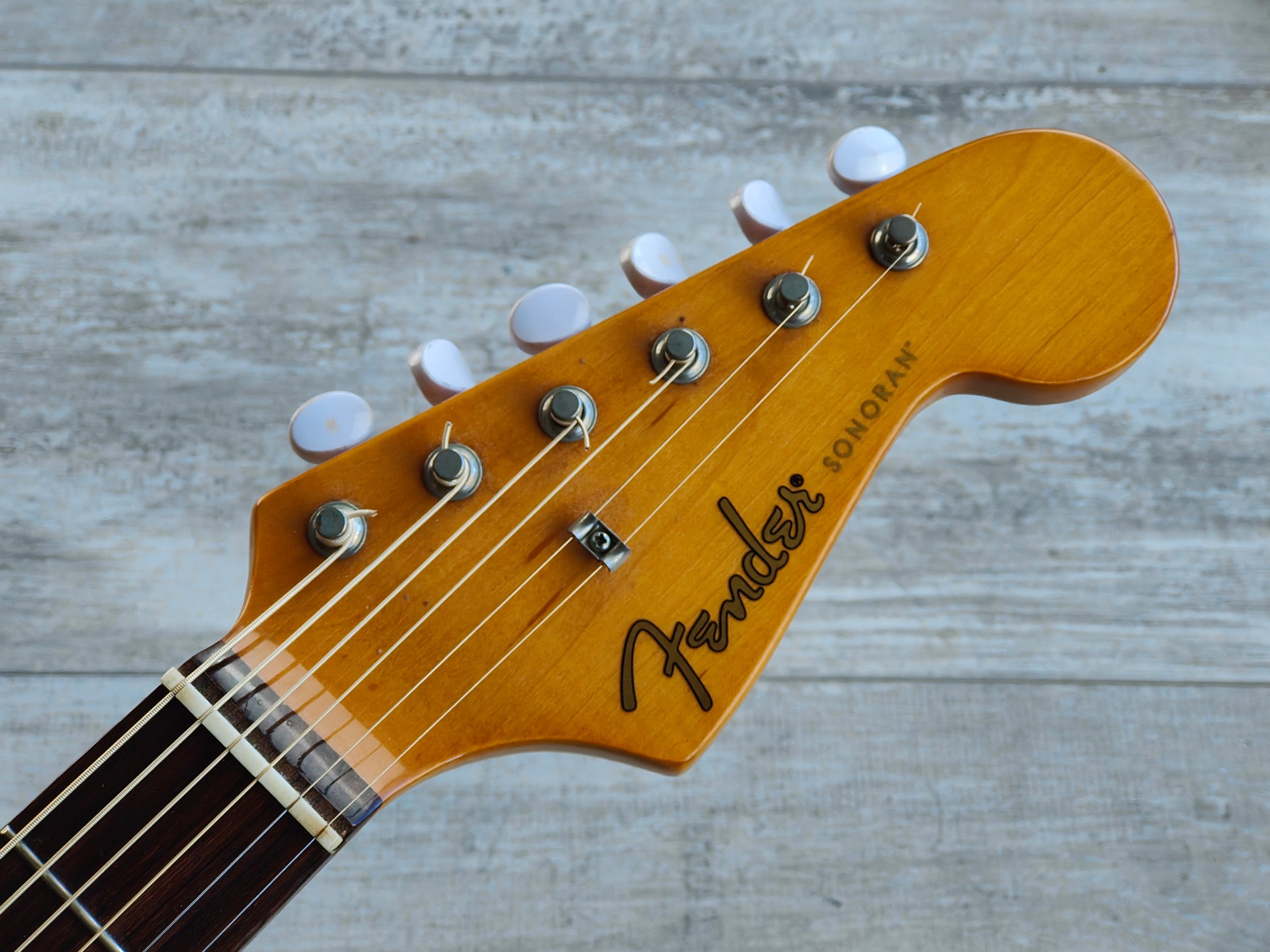 The new Fender Sonoran “Version 2” (V2) features the fabulous look of a Gold Pickguard (Like the original ’60’s Fender Acoustics, with aged cream binding. Discarding the white pearloid guard and binding on the earlier version.
