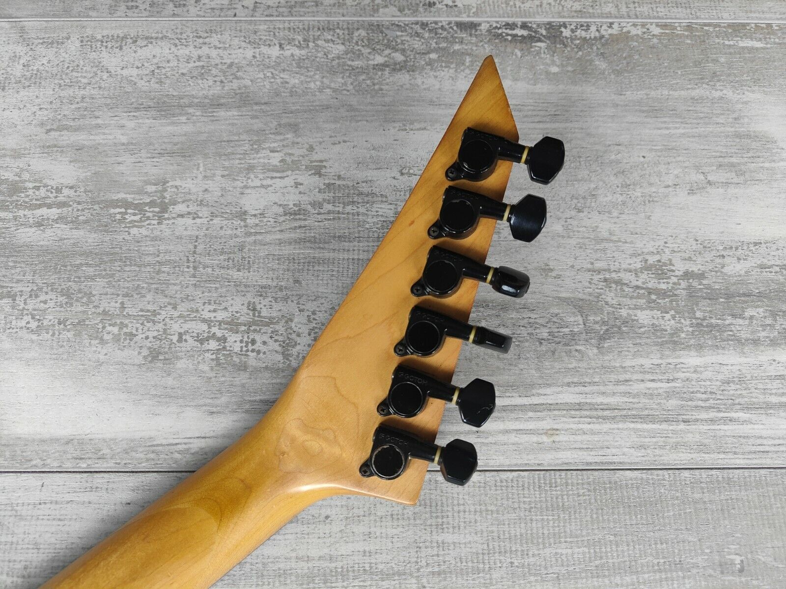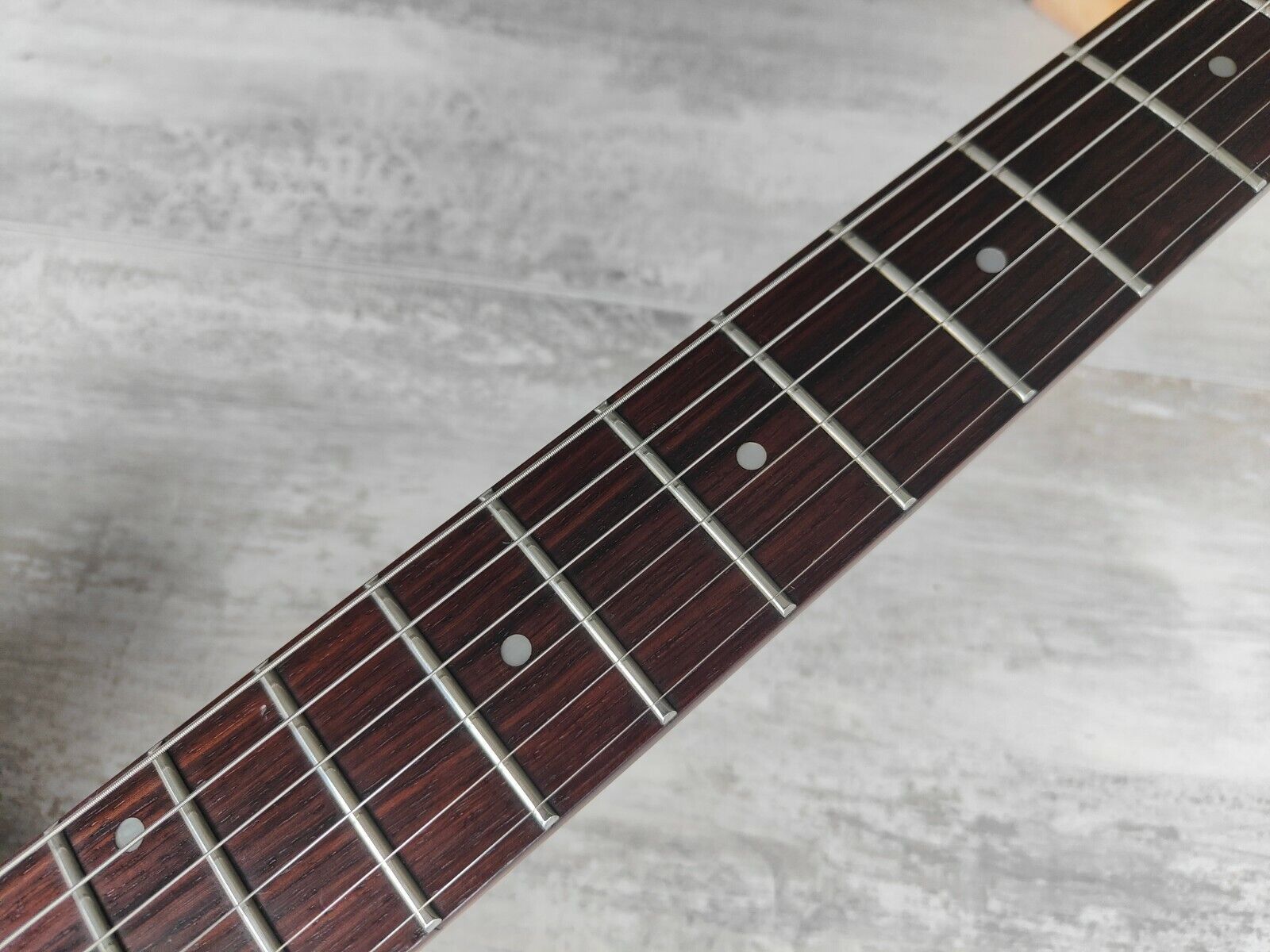 Made by Fernandes, the TEJ is an ultra-modern variation on the Fender Telecaster design. Glossy black finish on the body with cream binding, hardtail bridge, pointy headstock, Gotoh tuners and high-output passive single coil pickups. 22 frets with a 648mm scale length and 43mm nut width, it weighs 3.8kg’s.