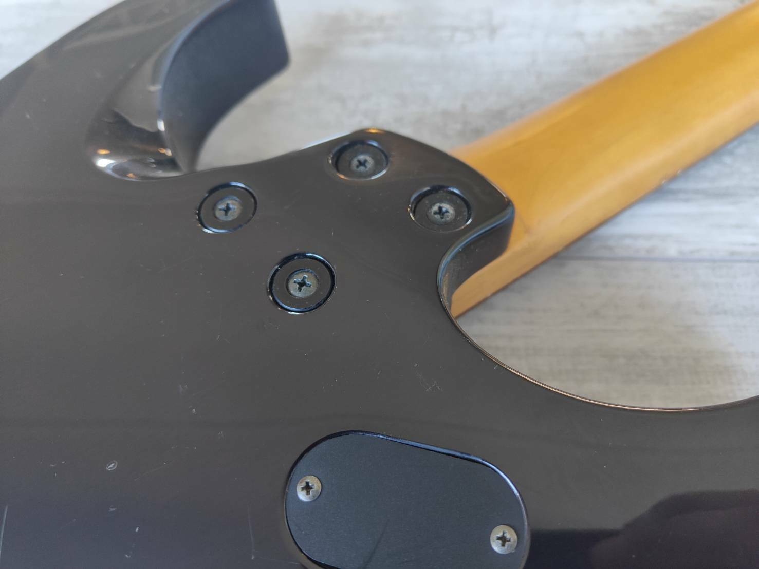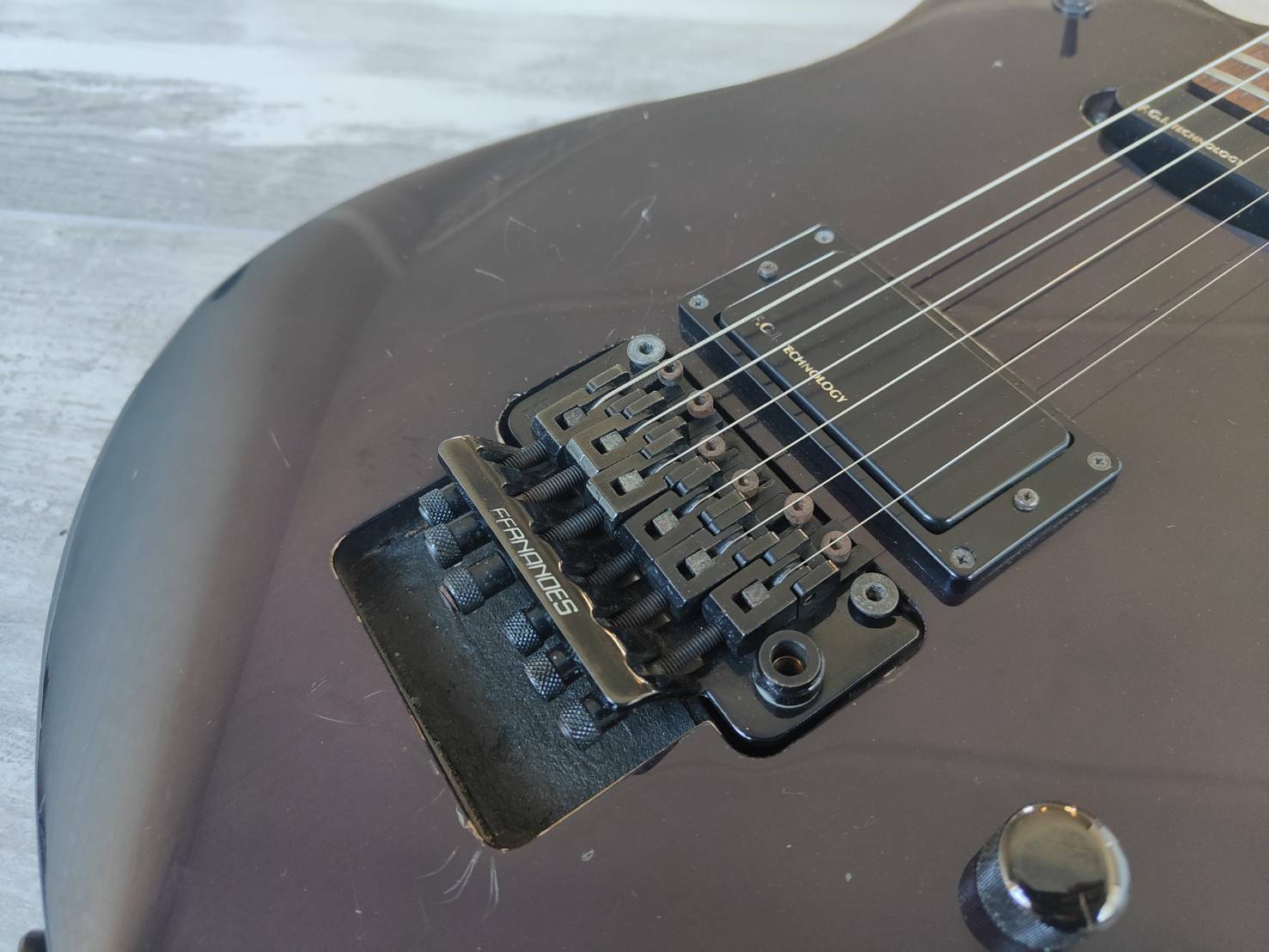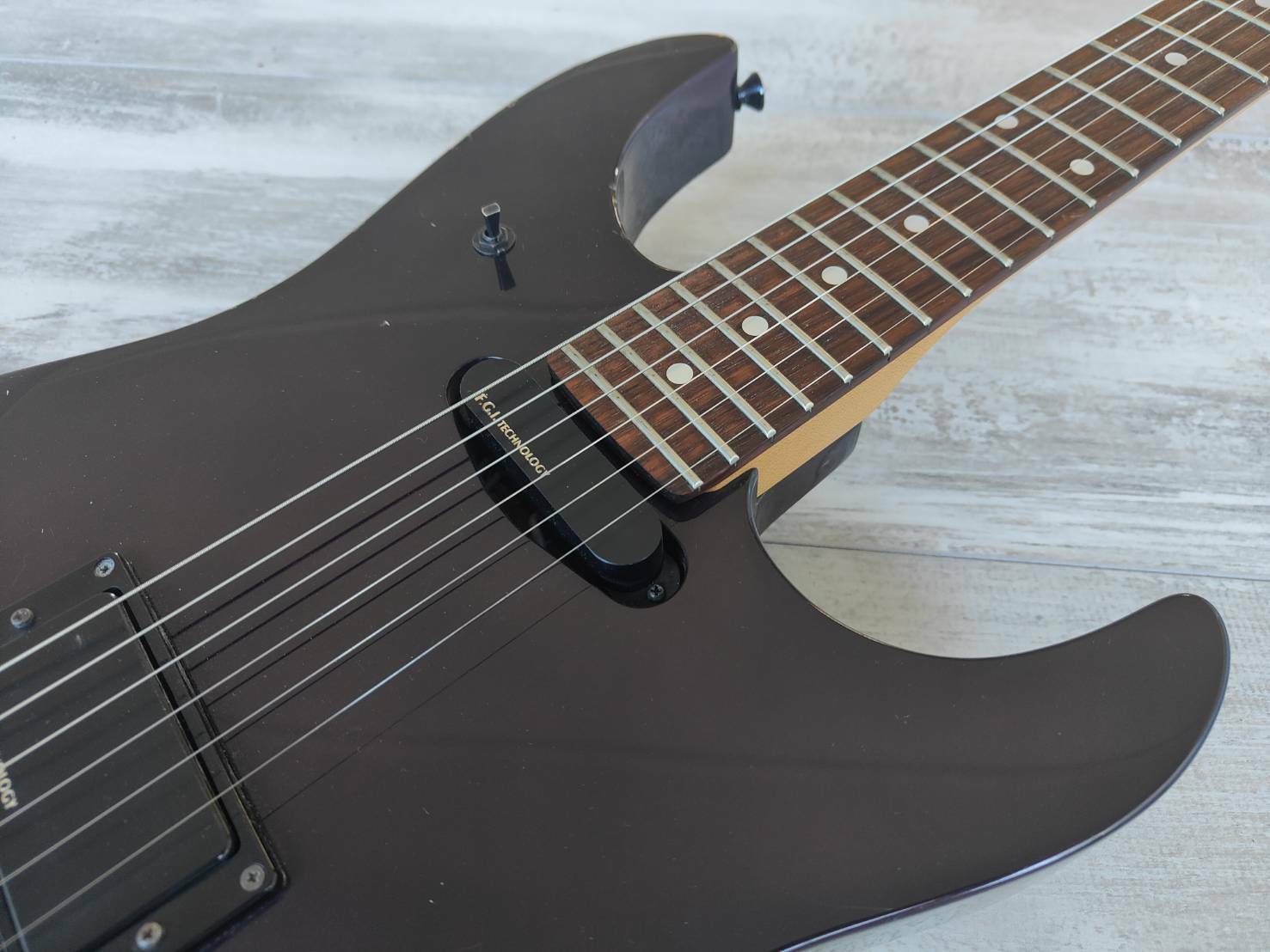 Made in Japan, the M-85C was an artist model designed with Ichiro Takigawa (CIPHER). Hard-to-photograph purple finish on the mahogany body with a thick maple top, slim maple neck and a 22 fret rosewood fingerboard (648mm scale length), weighs 3.7kg's. Loaded with active FGI active pickups and a FRT locking tremolo system.