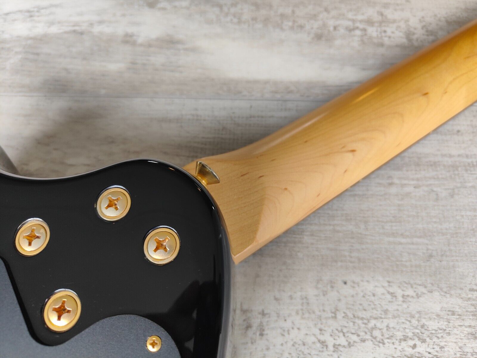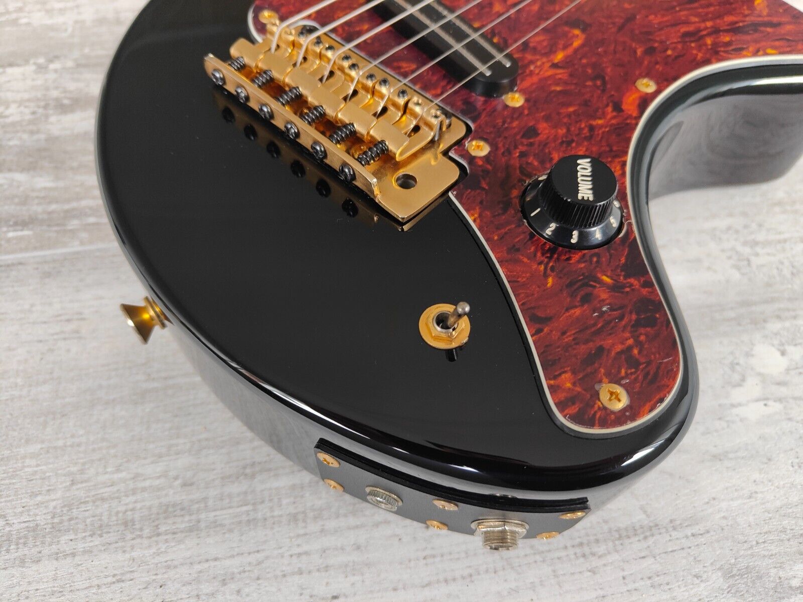 Black finish with a matching headstock, given a full setup and service prior to listing. Uncommon model with a single coil sized rail humbucker.