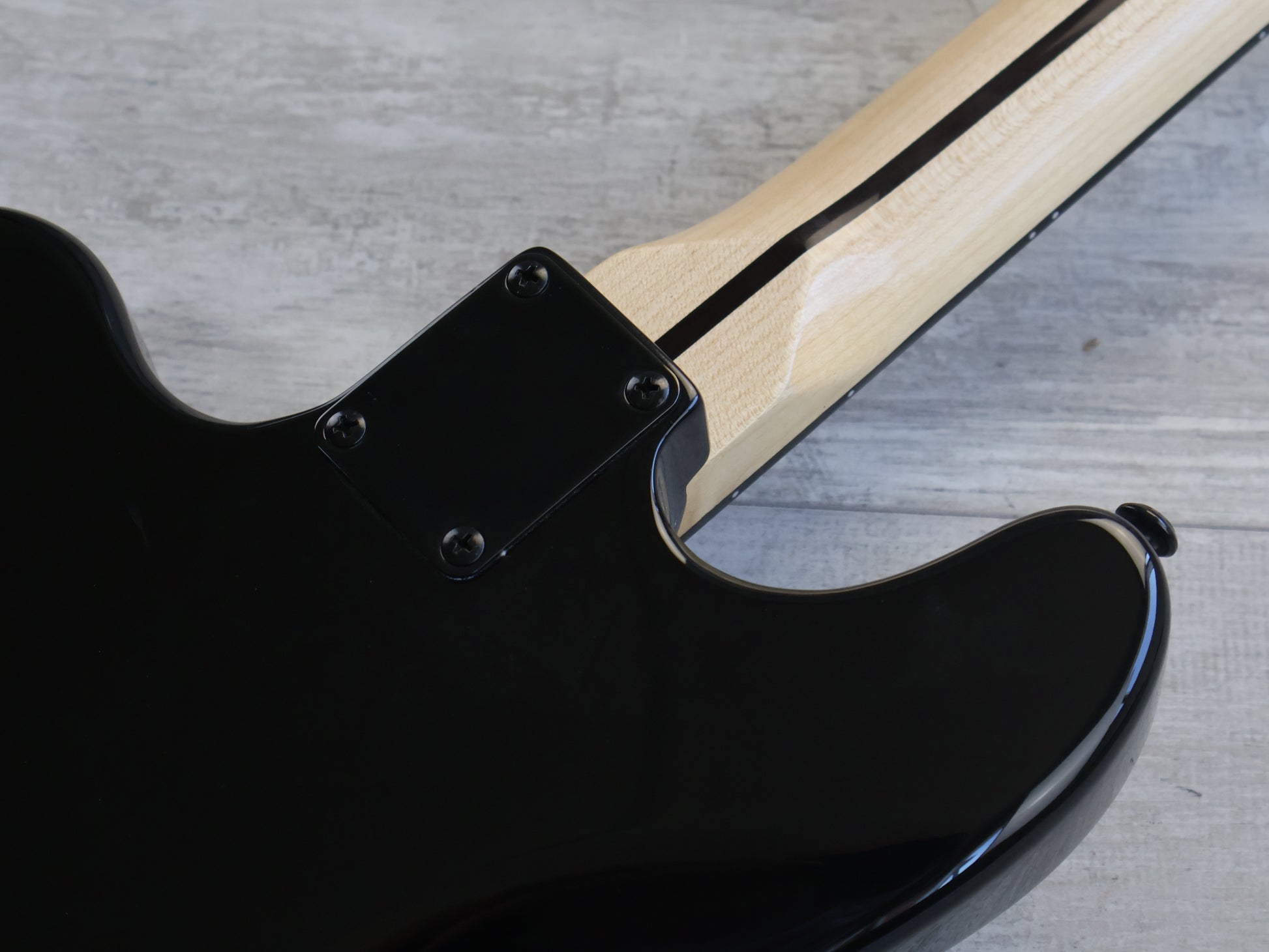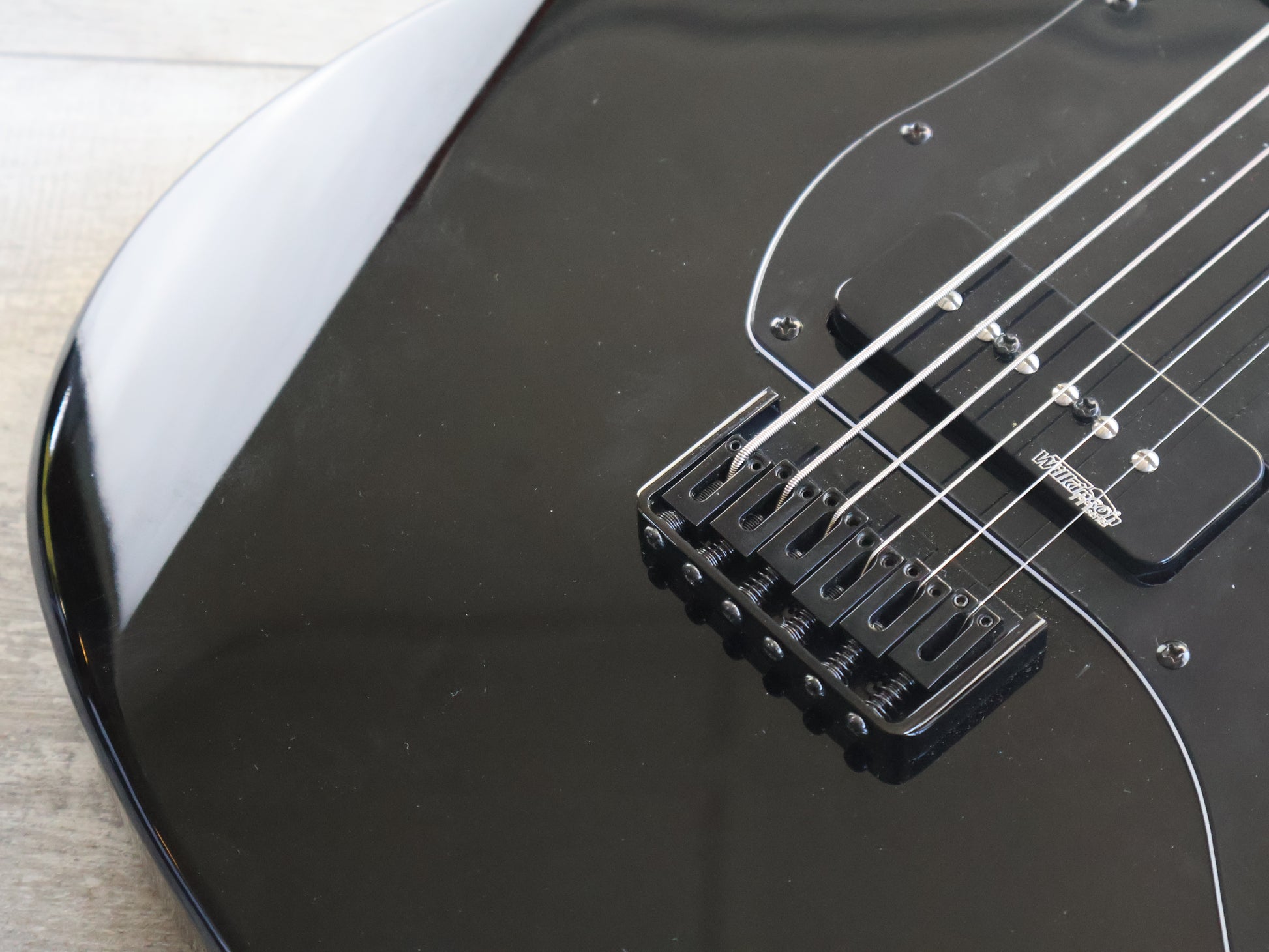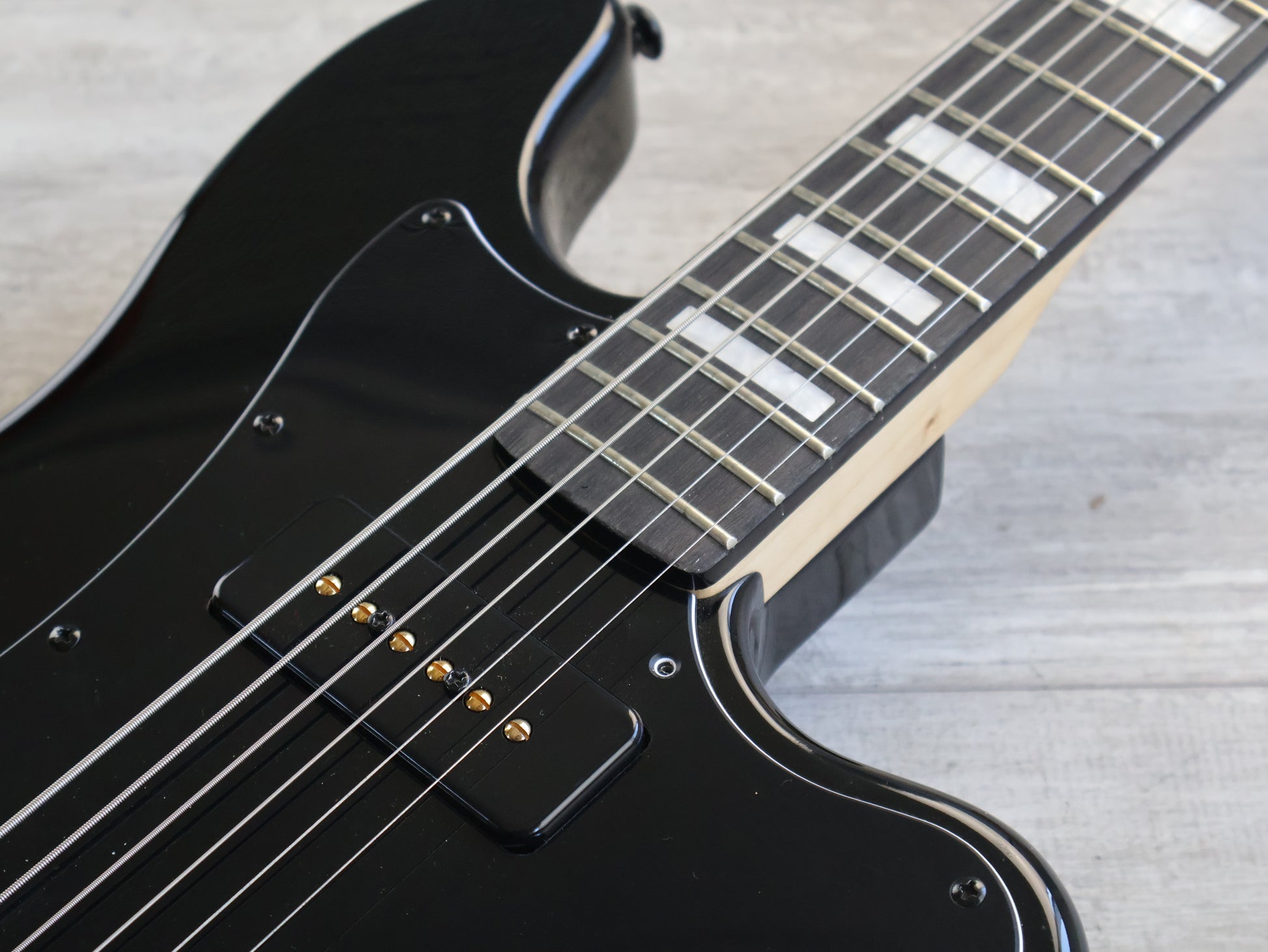The JA-Baritone: Perfect for stoner rock and surf music! This design extends the JA concept with a longer, 30" scale-length to add even more contour and power to your riffs. Loaded with two P-90 pickups, you get all the clarity of single-coil pickups, but with a more ferocious and powerful sound. Thanks to the fixed bridge the JA-Baritone can take all of the beating without going out of tune. The classic black gloss finish is just the icing on top!