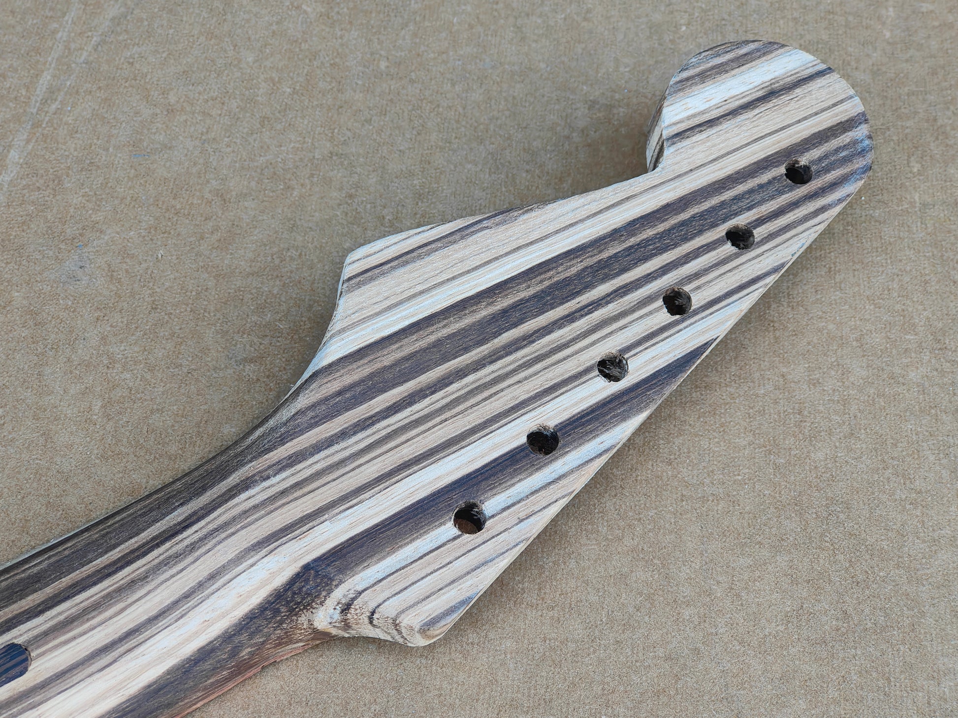 Looks to be NOS and is possibly Zebrawood or similar. Skunk stripe needs sanding/re-attachment as it's lifted slightly.