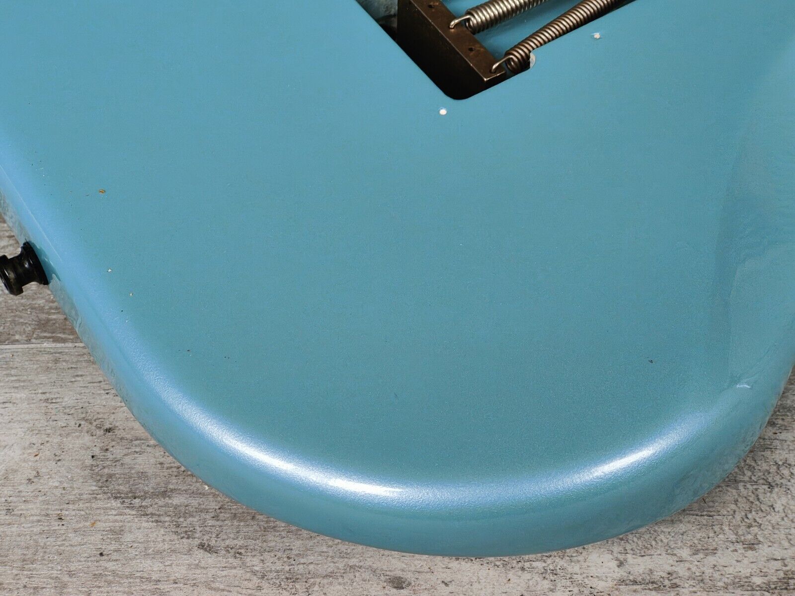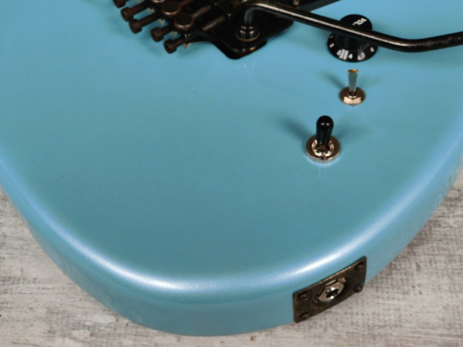 Made by Tokai in Japan in the mid 1980's, this is a Japanese market JK1000 model with a HS pickup configuration. An aftermarket acrylic metallic aqua refinish on a maple body with an aged white banana headstock on a reasonably thick maple neck with an almost V profile along with a lesser seen rosewood fingerboard (22 frets, 648mm scale length), weighs 3.7kg's.