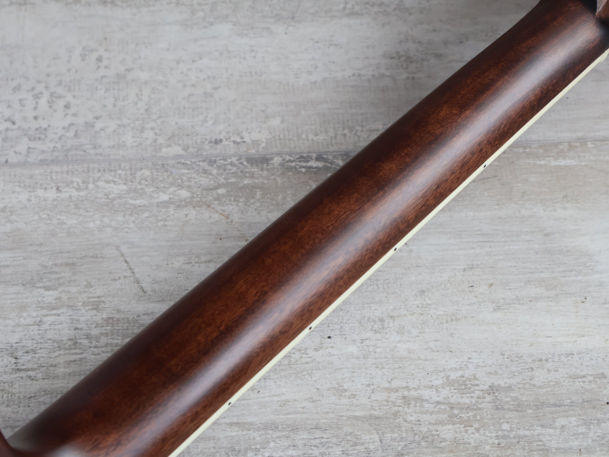 The engine of this guitar is the Sitka Spruce top, with a brightness and attack which brings the dark Rosewood to life. Rosewood is thought of by luthiers as a “slow” wood, lacking the quick response of, say, maple, but rewarding with acres of sustain and rich overtones. These woods are combined in a traditional 000 body. Smaller and shallower than a big dreadnought, this guitar is ideal for seated playing, while a balanced tonal response amply rewards more intricate playing styles.