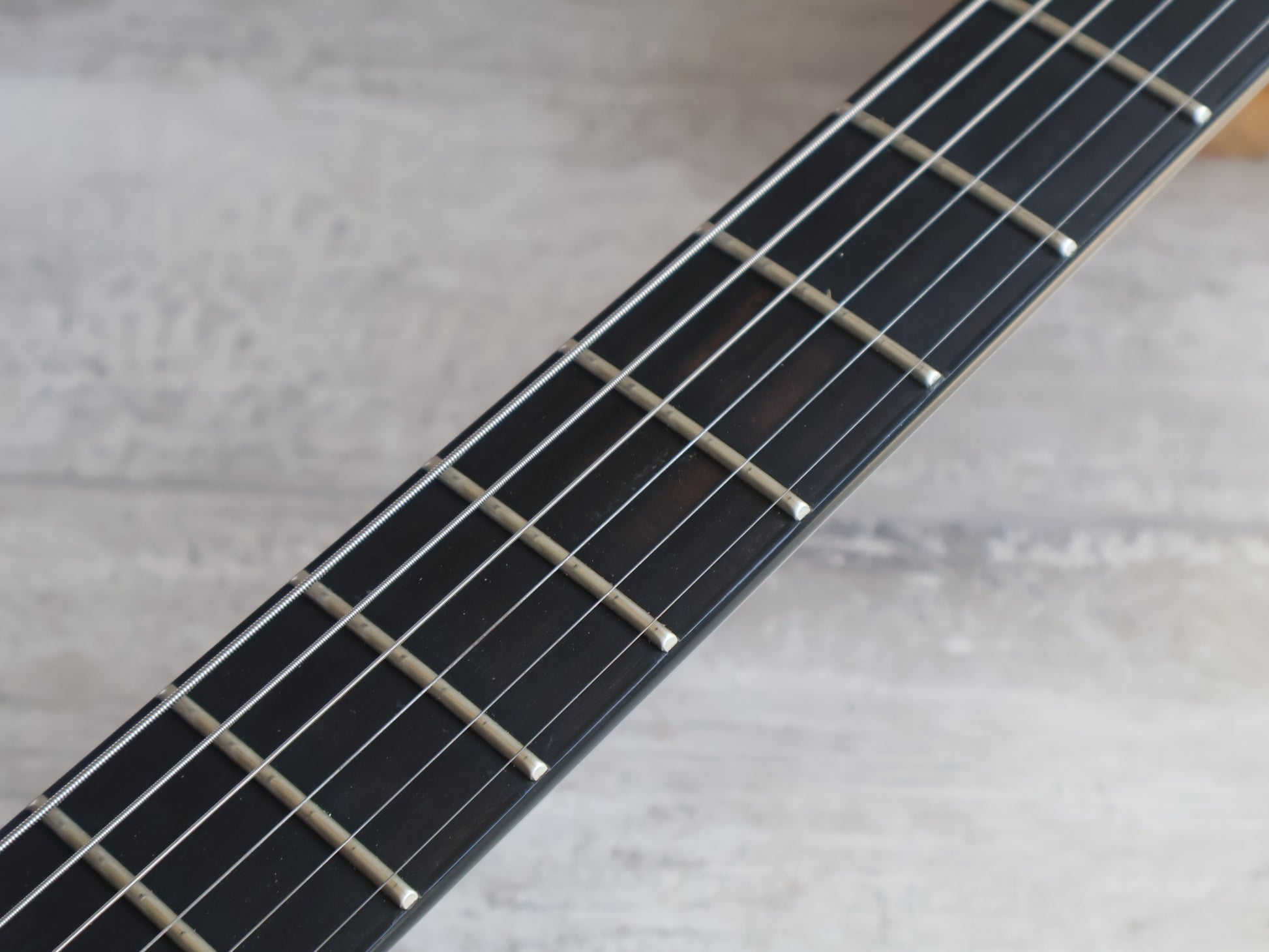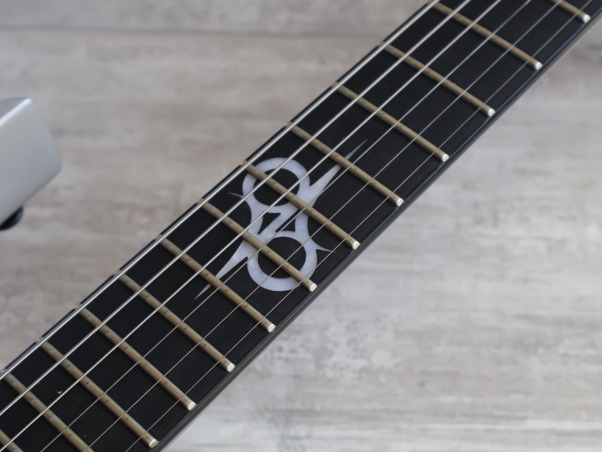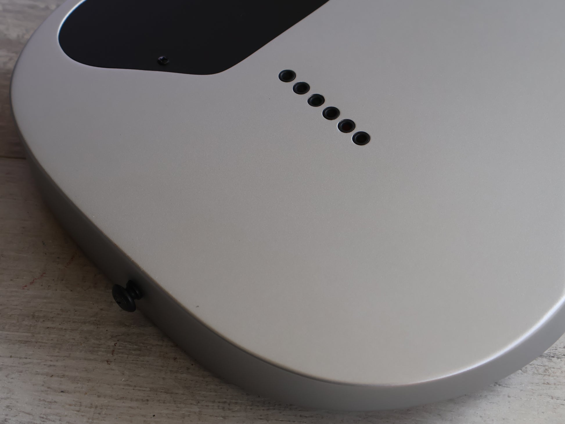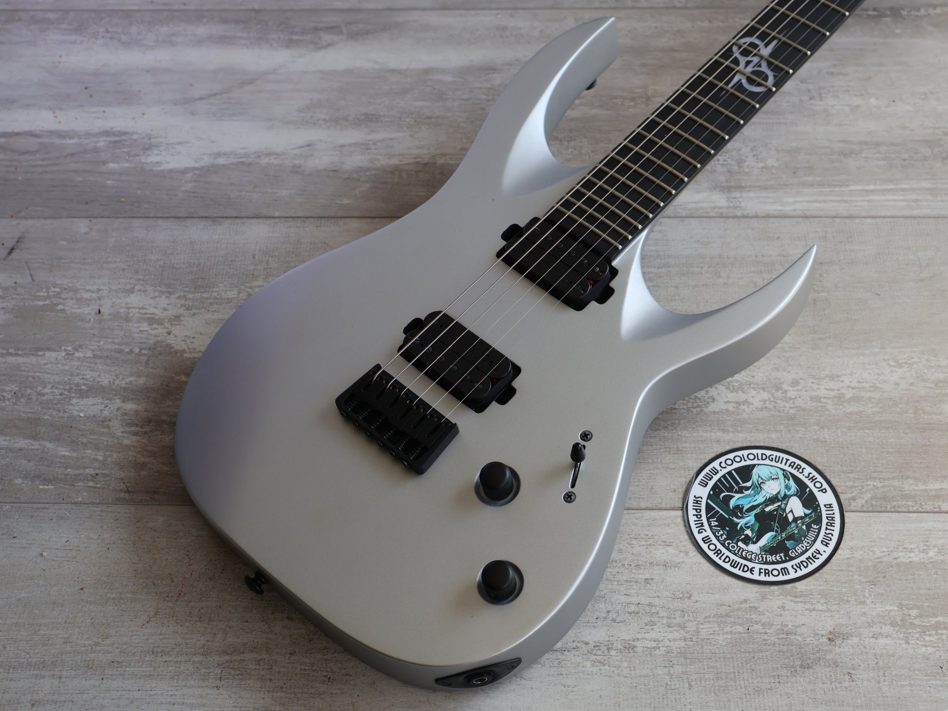 This Type A2.6 six-string guitar boasts stealth looks, a distinctive cutaway scoop and a remarkable feature set, making it a precise, professional instrument suitable for both stage and studio work. It comes loaded with a reliable string-through-body hardtail bridge and a set of Duncan Solar pickups that provide a full spectrum of tonal options, from organic clean to heavily overdriven, all with fluid sustain and maximum clarity. The Type A2.6 features a set-thru neck/body joint design with 25.5” scale, a mahogany body, a fast, thin, comfortable maple neck and an ebony fingerboard with 24 super-jumbo frets. It includes Solar 18:1 tuners, graphite nut, black matte hardware, five-way blade pickup switching and full access neck. Available in antique silver matte finish.