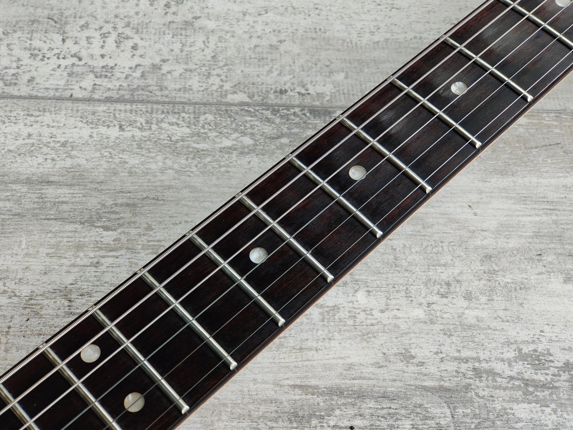Made in 2021 and modified by the previous owner with a pair of Bareknuckle Boot Camp True Grit humbuckers and an Emerson wiring harness. Currently set up with some heavier strings and tuned to Drop C, chuggs along beautifully!