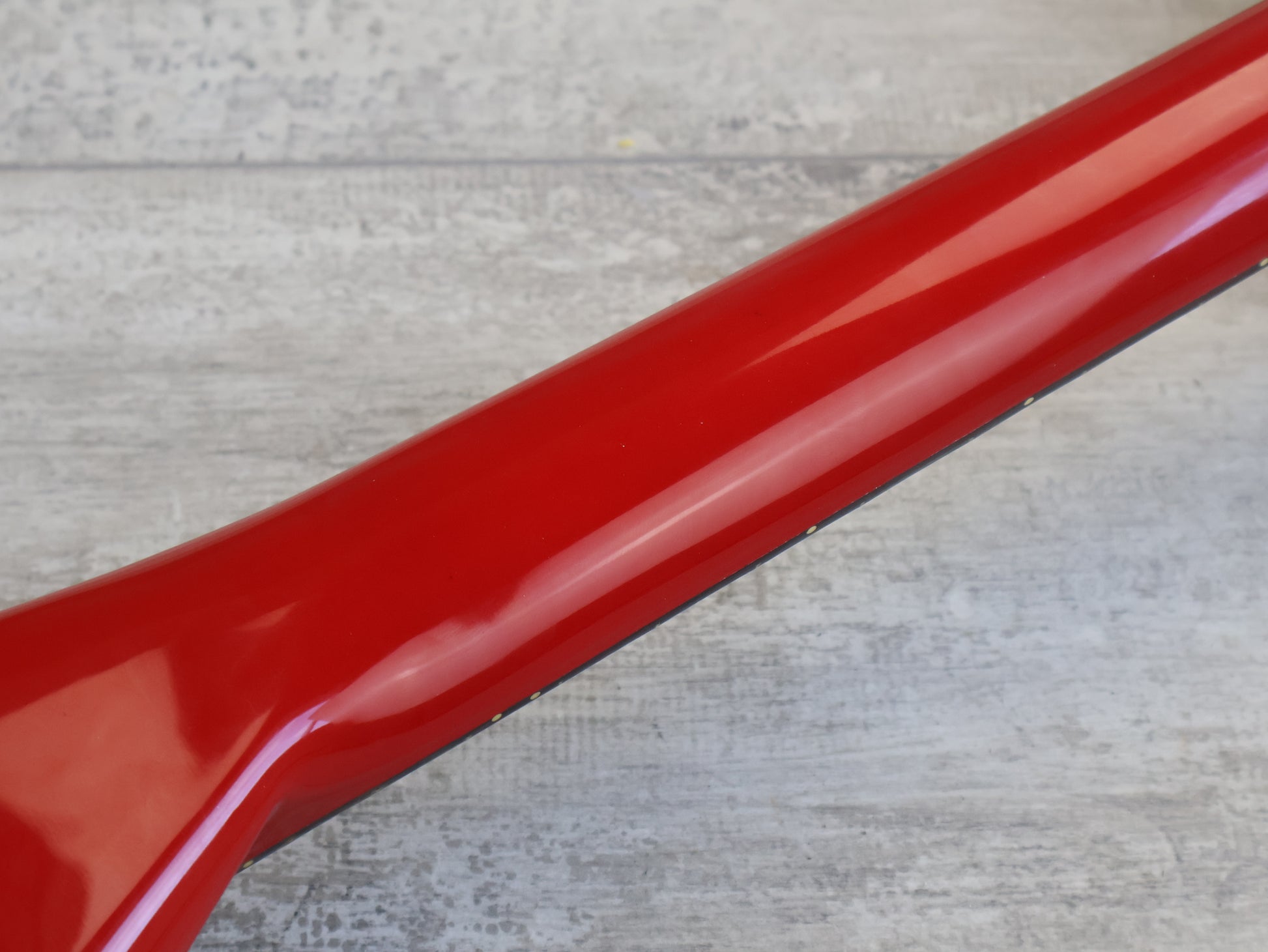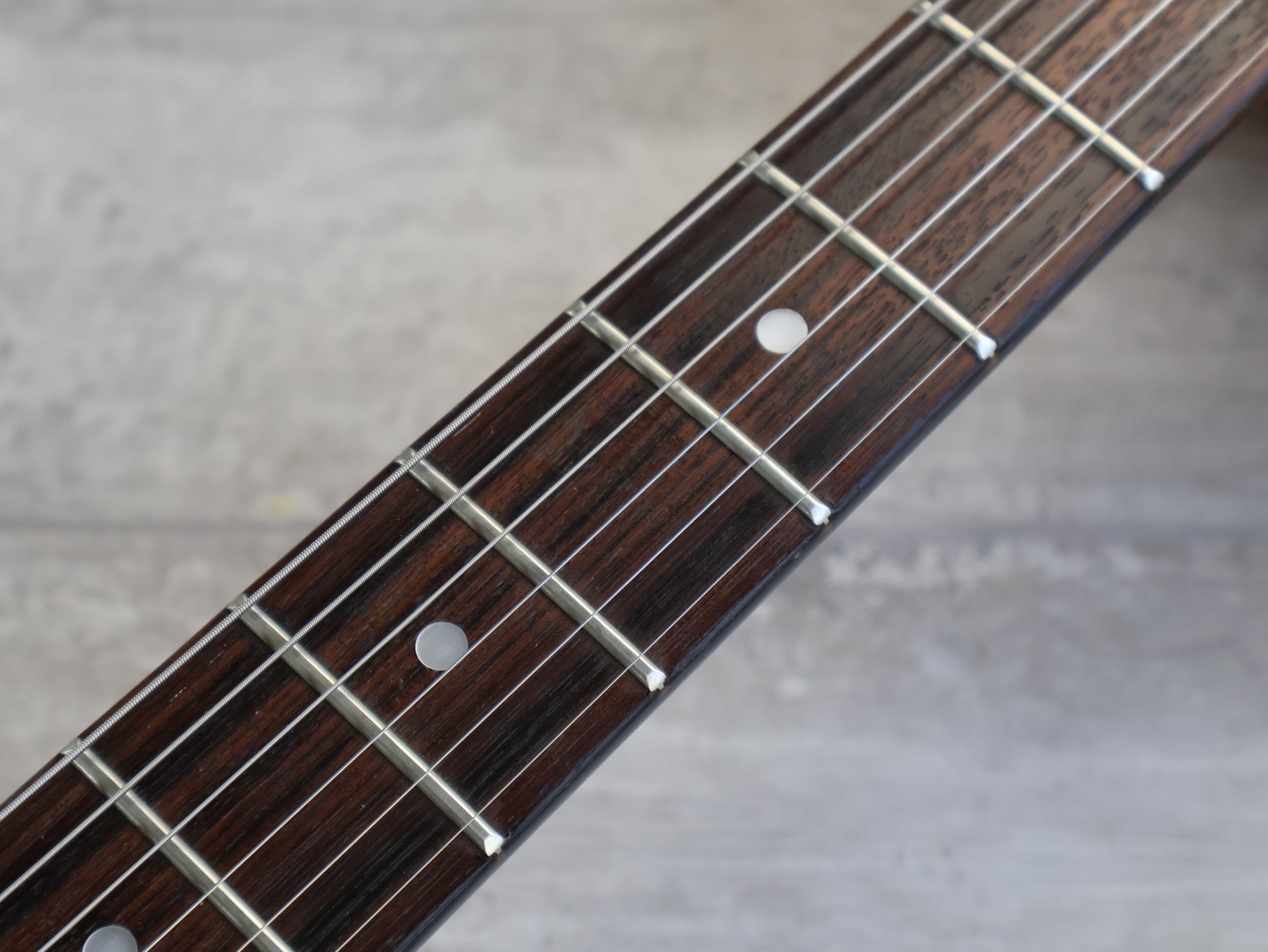 No branding anywhere and no markings inside or out, seems to be a solid neckthrough construction though and has a locking nut (unlike most). Very good overall condition with a few signs of wear and tear, restrung and plays great with plenty of life in the frets and a straight neck with an adjustable truss.