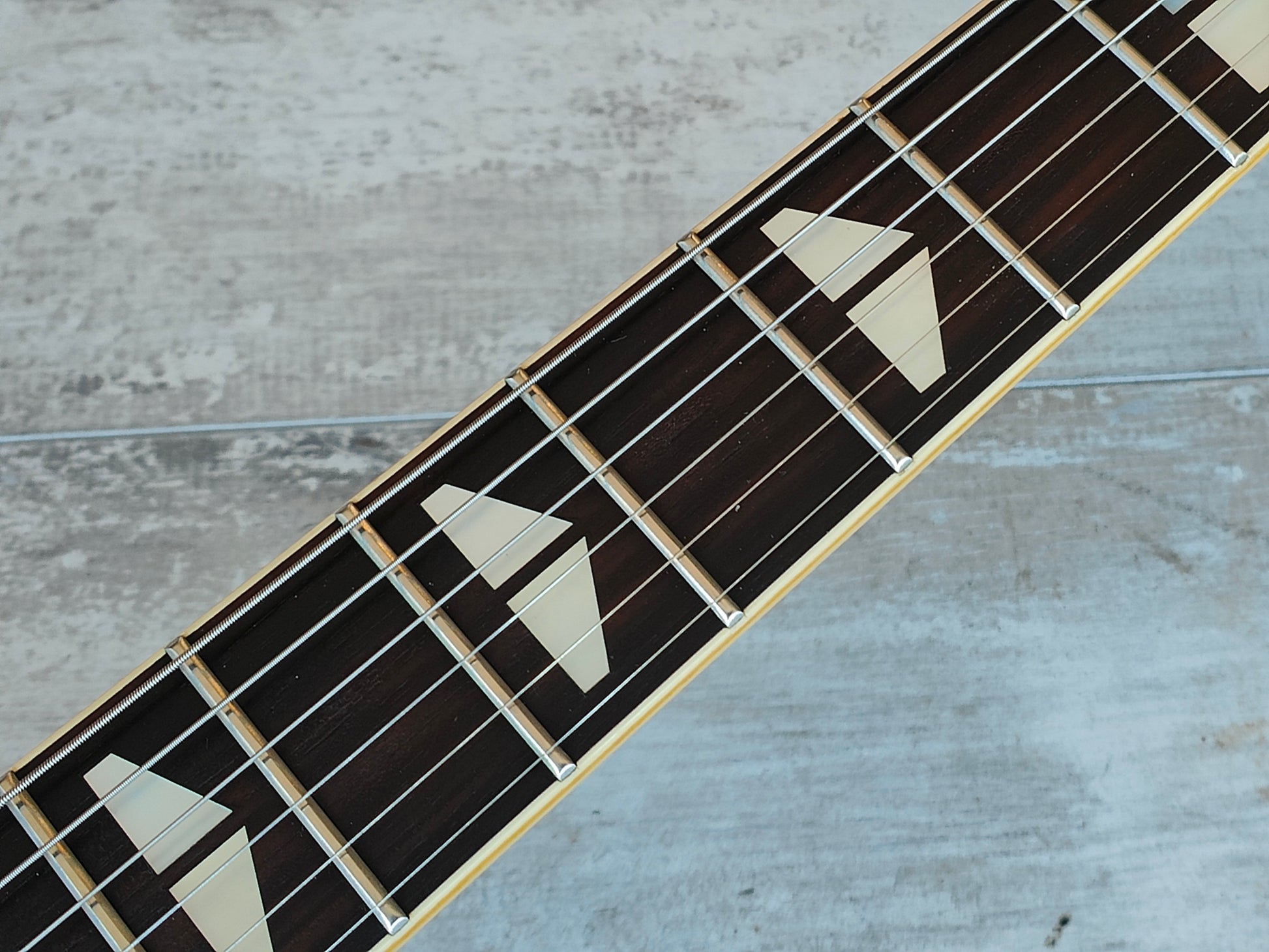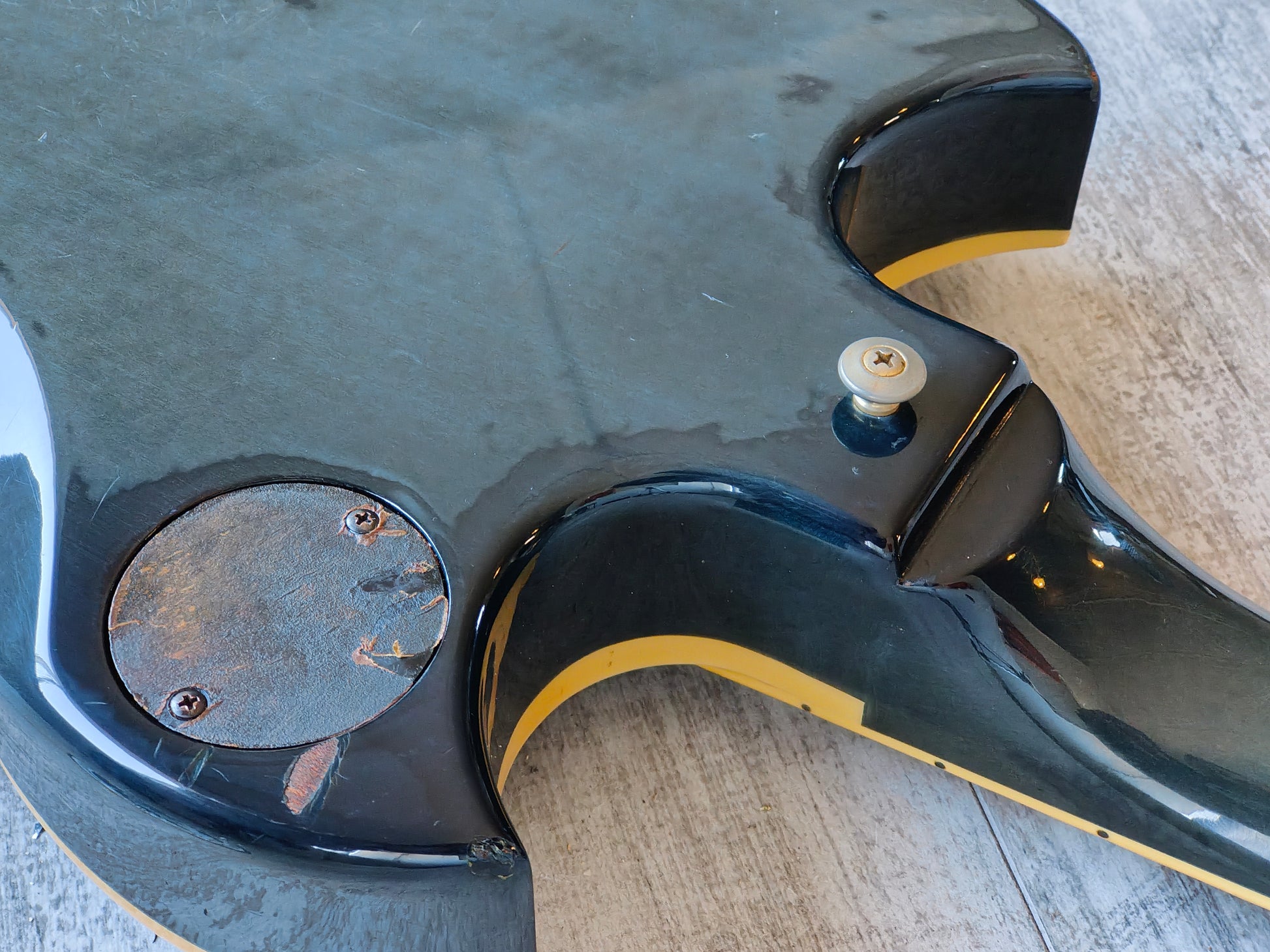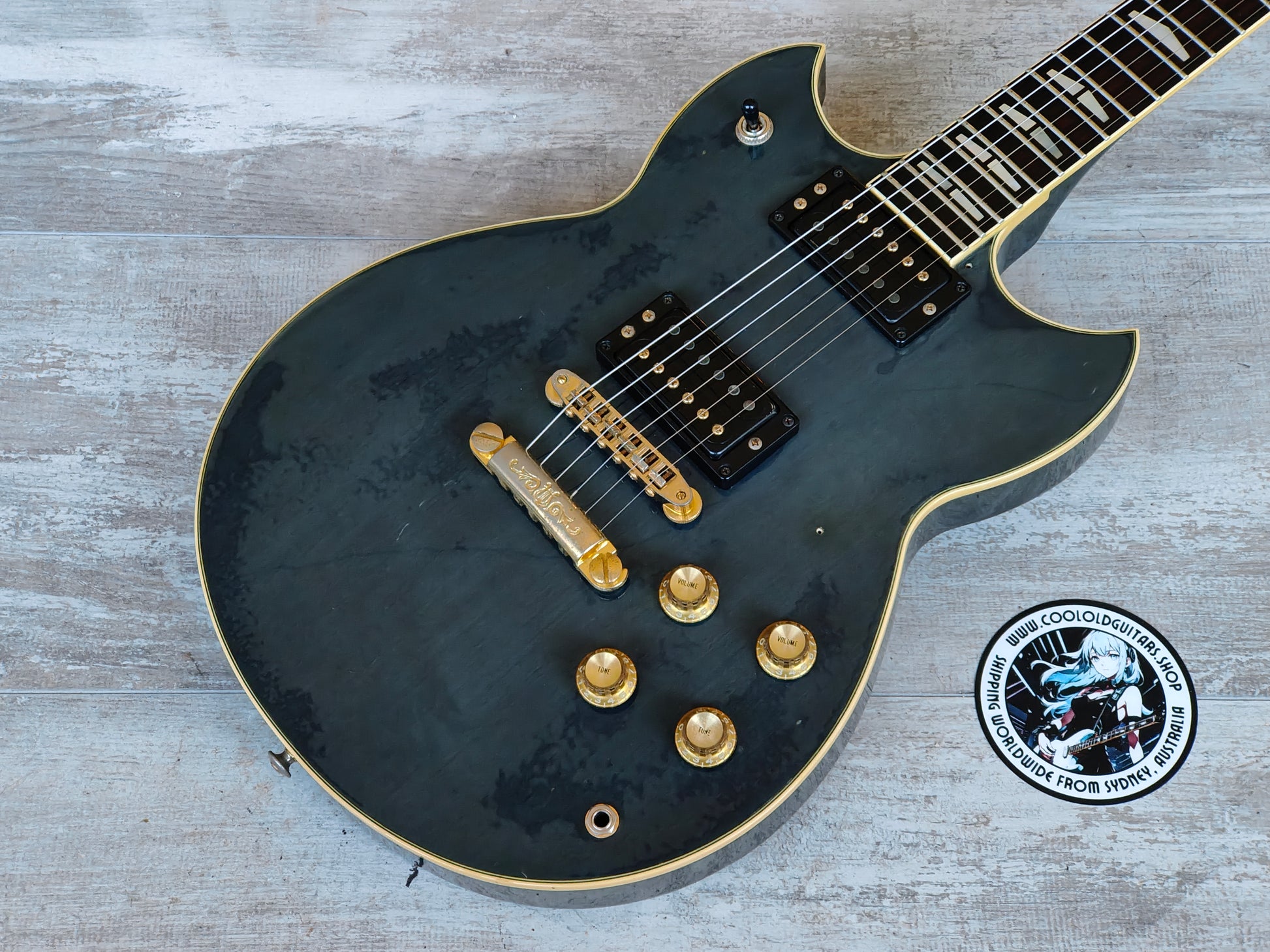 This one has some clouding on the finish that's faded the colour closer to black than blue and has a few bumps and dings from general use over 40 years. Received a professional setup and service prior to listing, plays well with a straight neck, adjustable truss and shiny frets with life left.